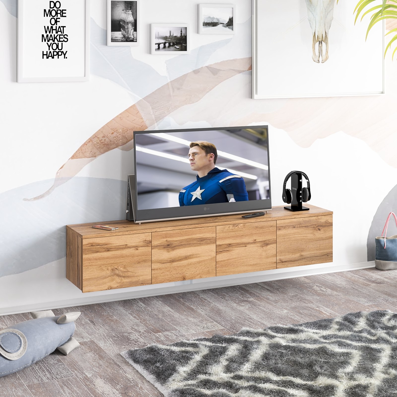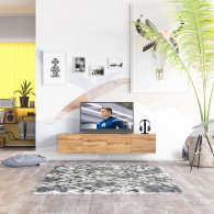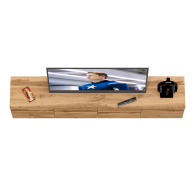 Благодаря подвесной конструкции тумба освобождает пространство на полу и визуально облегчает интерьер. В центральной части тумбы расположены два вместительных выдвижных ящика на шариковых направляющих. По бокам находятся отделения без полок, каждое скрыто за распашной дверкой. Подвесная установка позволяет не только сэкономить пространство, но и упростить уборку и прокладку кабелей. Тумба выполнена без ручек — ящики и дверцы открываются за край фасадов, подчёркивая лаконичный стиль. Монтаж осуществляется с помощью трёх надёжных угловых навесов, обеспечивающих устойчивое крепление на стене.