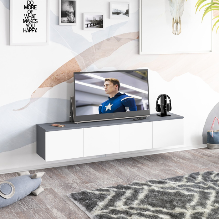 Благодаря подвесной конструкции тумба освобождает пространство на полу и визуально облегчает интерьер. В центральной части тумбы расположены два вместительных выдвижных ящика на шариковых направляющих. По бокам находятся отделения без полок, каждое скрыто за распашной дверкой. Подвесная установка позволяет не только сэкономить пространство, но и упростить уборку и прокладку кабелей. Тумба выполнена без ручек — ящики и дверцы открываются за край фасадов, подчёркивая лаконичный стиль. Монтаж осуществляется с помощью трёх надёжных угловых навесов, обеспечивающих устойчивое крепление на стене.