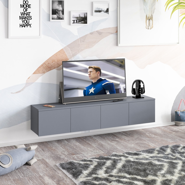Благодаря подвесной конструкции тумба освобождает пространство на полу и визуально облегчает интерьер. В центральной части тумбы расположены два вместительных выдвижных ящика на шариковых направляющих. По бокам находятся отделения без полок, каждое скрыто за распашной дверкой. Подвесная установка позволяет не только сэкономить пространство, но и упростить уборку и прокладку кабелей. Тумба выполнена без ручек — ящики и дверцы открываются за край фасадов, подчёркивая лаконичный стиль. Монтаж осуществляется с помощью трёх надёжных угловых навесов, обеспечивающих устойчивое крепление на стене.