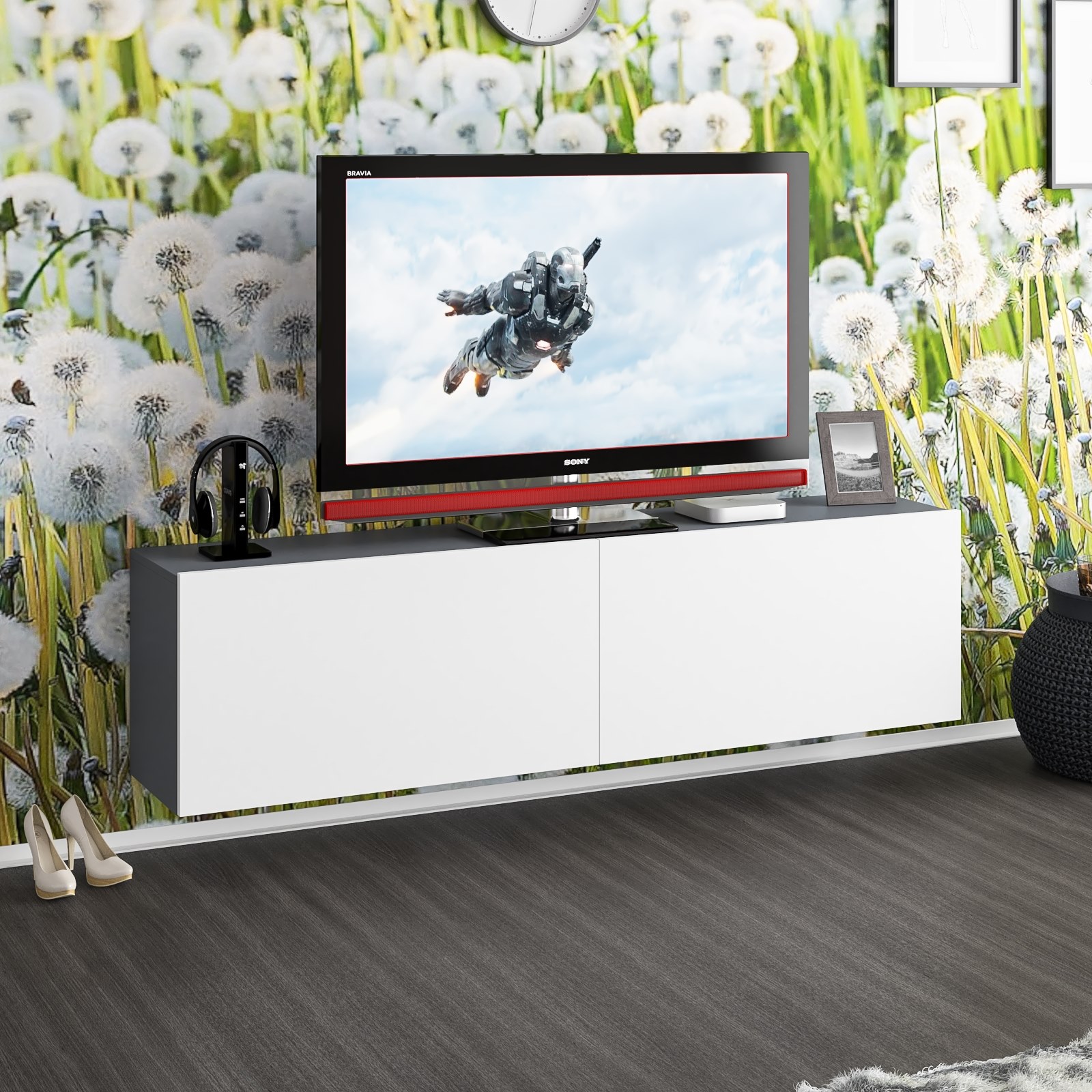 Благодаря подвесному монтажу, модель не занимает место на полу, создаёт ощущение легкости и упрощает уборку. Тумба состоит из двух просторных отделений, скрытых за откидными дверками на газлифтах, обеспечивающими плавное и бесшумное открывание. Отделения не имеют внутренних перегородок, благодаря чему подходят для хранения различной техники, медиаприставок и аксессуаров. Подвесная конструкция облегчает визуальное восприятие пространства и делает интерьер более современным. Фасады не имеют ручек — дверки открываются за край, подчёркивая минималистичный дизайн. Монтаж осуществляется при помощи трёх надёжных угловых навесов, обеспечивающих стабильную фиксацию на стене.
