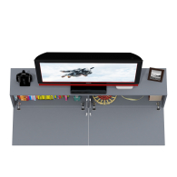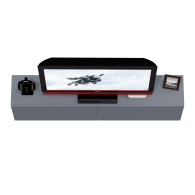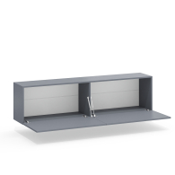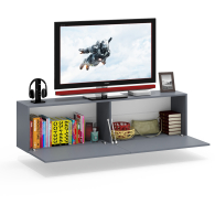 Благодаря подвесному монтажу, модель не занимает место на полу, создаёт ощущение легкости и упрощает уборку. Тумба состоит из двух просторных отделений, скрытых за откидными дверками на газлифтах, обеспечивающими плавное и бесшумное открывание. Отделения не имеют внутренних перегородок, благодаря чему подходят для хранения различной техники, медиаприставок и аксессуаров. Подвесная конструкция облегчает визуальное восприятие пространства и делает интерьер более современным. Фасады не имеют ручек — дверки открываются за край, подчёркивая минималистичный дизайн. Монтаж осуществляется при помощи трёх надёжных угловых навесов, обеспечивающих стабильную фиксацию на стене.