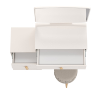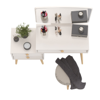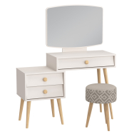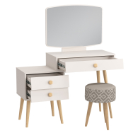 Трюмо объединяет функции туалетного столика и малой тумбы, предлагая удобные столешницы на разных уровнях для различных нужд. Оно оснащено тремя просторными выдвижными ящиками на шариковых направляющих полного выдвижения - один под столешницей столика и два в секции тумбы. Большое зеркало, расположенное над столешницей туалетного столика, создаёт удобную рабочую зону для ухода за собой, а также визуально расширяет пространство. Декоративные деревянные ручки круглой формы акцентируют внимание на природной эстетике, гармонично завершая его дизайн Трюмо установлено на высокие опоры из массива березы, которые добавляют лёгкости конструкции. Высота ножек у туалетного столика составляет 60 см, а у тумбы – 30 см, что подчёркивает элегантность изделия и облегчает уборку. Выполнено трюмо из ламинированной ДСП толщиной 16 мм, торцы окромлены ПХВ плёнкой.