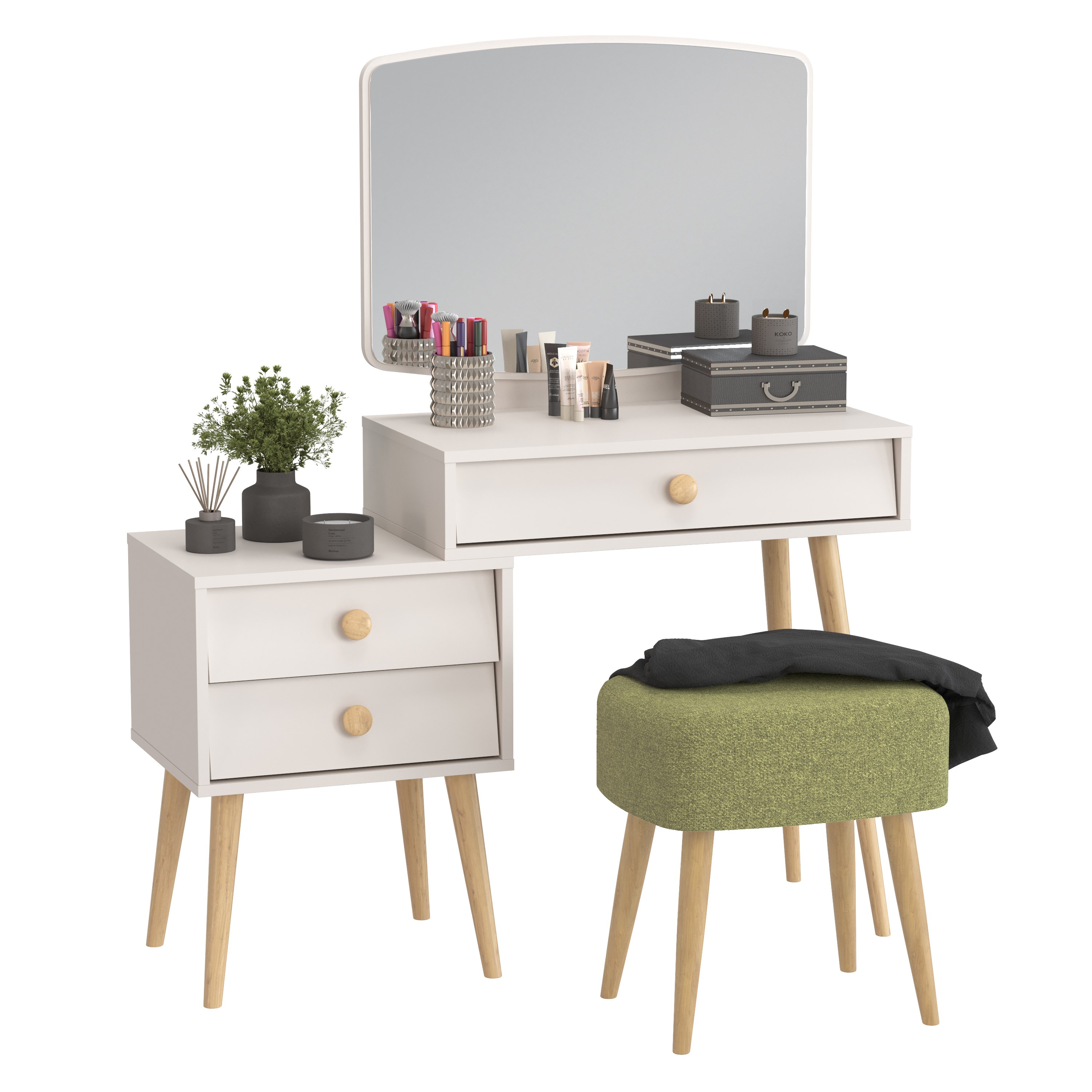Трюмо объединяет функции туалетного столика и малой тумбы, предлагая удобные столешницы на разных уровнях для различных нужд. Оно оснащено тремя просторными выдвижными ящиками на шариковых направляющих полного выдвижения - один под столешницей столика и два в секции тумбы. Большое зеркало, расположенное над столешницей туалетного столика, создаёт удобную рабочую зону для ухода за собой, а также визуально расширяет пространство. Декоративные деревянные ручки круглой формы акцентируют внимание на природной эстетике, гармонично завершая его дизайн Трюмо установлено на высокие опоры из массива березы, которые добавляют лёгкости конструкции. Высота ножек у туалетного столика составляет 60 см, а у тумбы – 30 см, что подчёркивает элегантность изделия и облегчает уборку. Выполнено трюмо из ламинированной ДСП толщиной 16 мм, торцы окромлены ПХВ плёнкой.