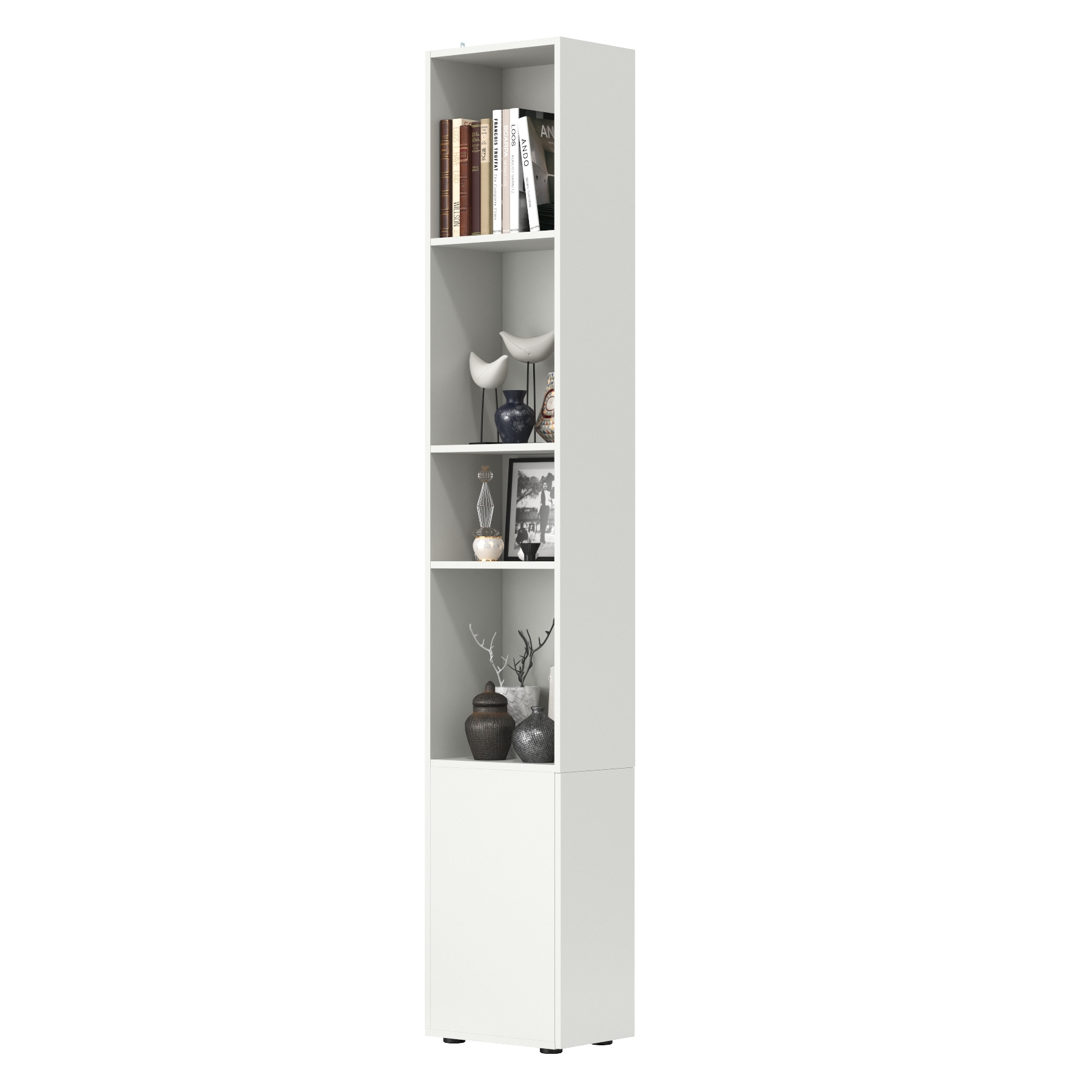Компактный и вместительный, он создаёт цельный и законченный облик интерьера. Габариты шкафа позволяют разместить его в торце гарнитура или использовать как самостоятельный элемент. Модель оснащена тремя открытыми полками, расположенными сверху с одной стороны — удобно для хранения книг, аксессуаров и элементов декора. В нижней части, в торце, предусмотрено закрытое отделение с дверцей и внутренней полкой для хранения вещей, которые хочется скрыть от глаз. Узкий и высокий формат делает шкаф универсальным решением для прихожей, спальни или гостиной.