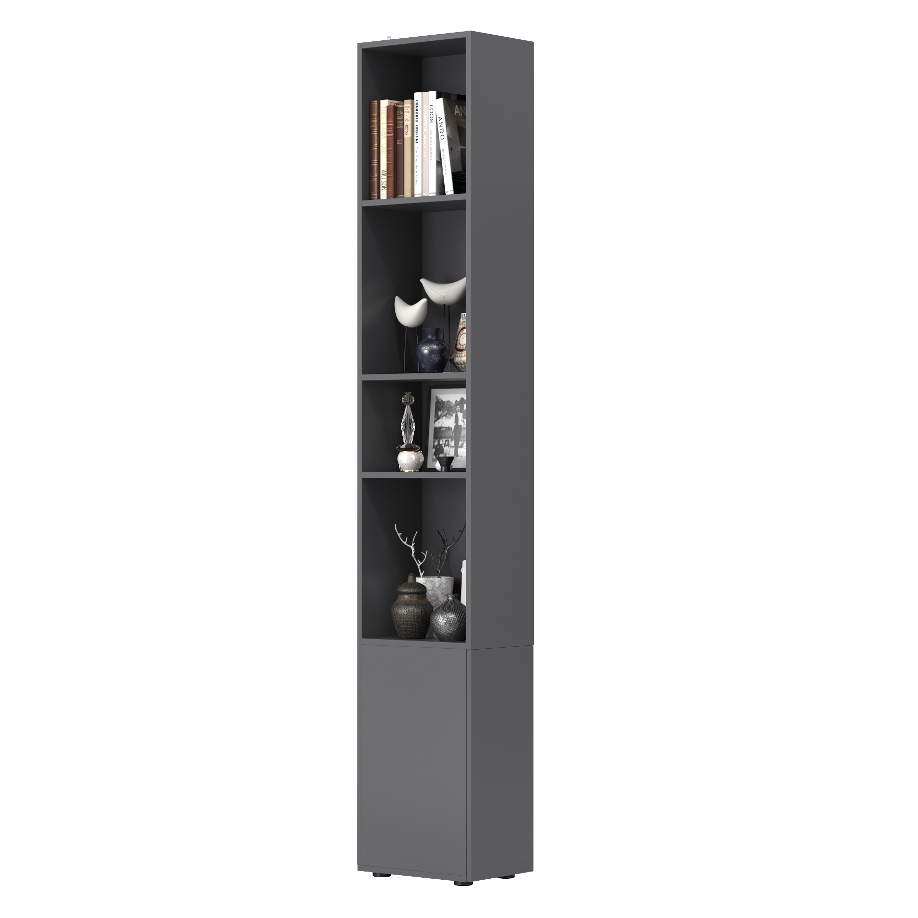 Компактный и вместительный, он создаёт цельный и законченный облик интерьера. Габариты шкафа позволяют разместить его в торце гарнитура или использовать как самостоятельный элемент. Модель оснащена тремя открытыми полками, расположенными сверху с одной стороны — удобно для хранения книг, аксессуаров и элементов декора. В нижней части, в торце, предусмотрено закрытое отделение с дверцей и внутренней полкой для хранения вещей, которые хочется скрыть от глаз. Узкий и высокий формат делает шкаф универсальным решением для прихожей, спальни или гостиной.
