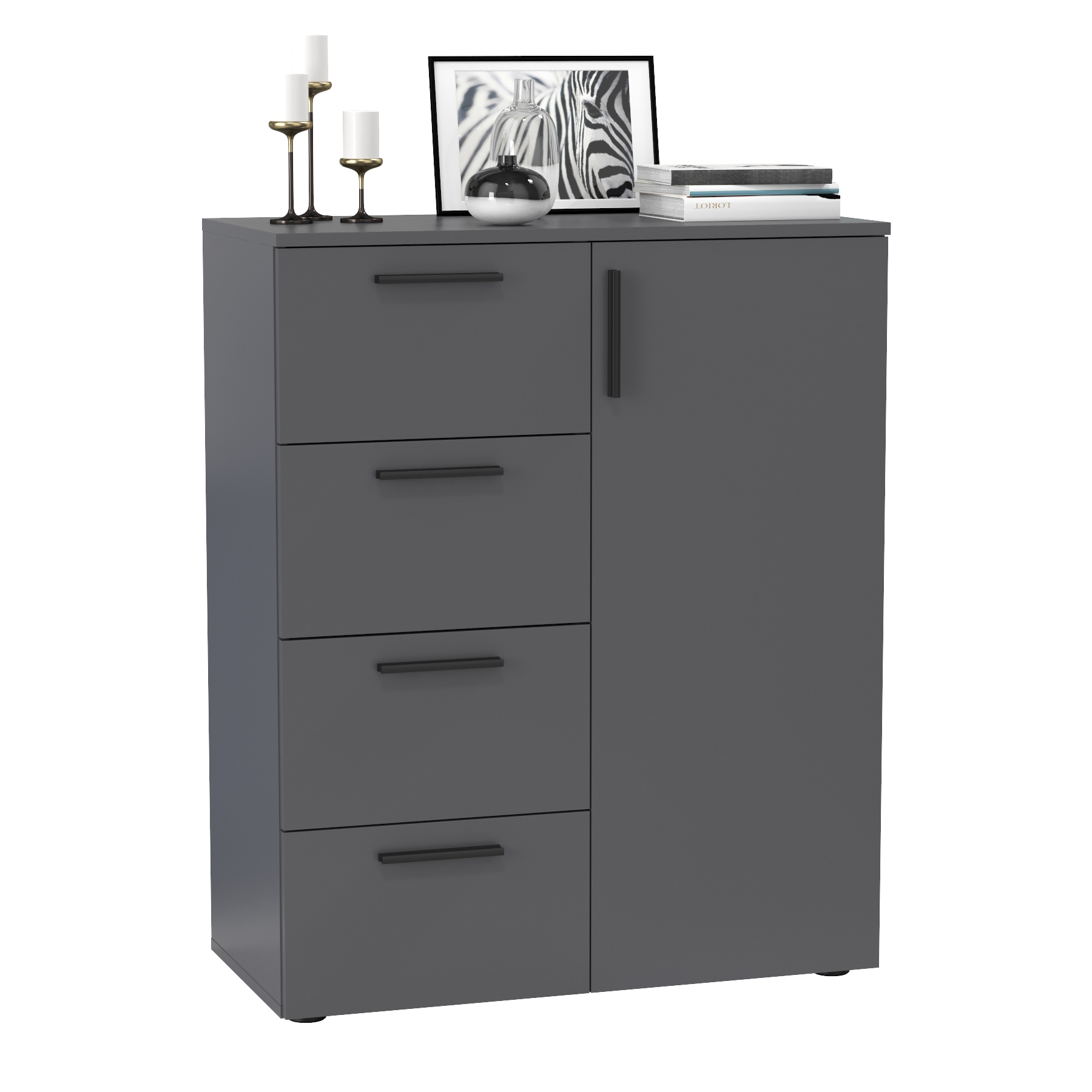 Вместительные ящики позволят удобно организовать хранение вещей. Комод Эйр 16.241 отлично впишется в интерьер прихожей, гостиной, спальни или детской. Он оснащён отделением с двумя полками за распашной дверцей и четырьмя выдвижными ящиками на шариковых направляющих, обеспечивающих плавное и бесшумное открывание. Отделение за дверцей удобно для хранения белья, документов или коробок, а ящики подойдут для одежды, аксессуаров или мелочей. Конструкция комода продумана для комфортного использования — демпферы защищают фасады от резких ударов, а ящики легко выдвигаются на всю глубину. Комод имеет универсальную сборку - дверцу и ящики можно расположить как слева, так и справа, в зависимости от нужд интерьера. Чёрная металлическая ручка завершает образ и подчёркивает современный стиль комода.