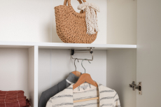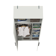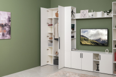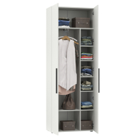 Шкаф Эйр 13.340 прекрасно подойдёт для размещения в прихожей, гостиной, спальне или детской. За двумя распашными дверками находится верхняя антресольная полка на всю ширину шкафа. Под антресолью расположены два отделения - одно с выдвижной штангой для одежды и нишей снизу, другое — с четырьмя съёмными полками и нижней нишей. Такое наполнение позволяет хранить как вещи на вешалках, так и аккуратно сложенные предметы гардероба. Всё внутреннее пространство организовано для максимального удобства и рационального хранения. Шкаф подходит для хранения как сезонной, так и повседневной одежды. Модель имеет универсальную сборку — отделения можно расположить как слева, так и справа, в зависимости от Ваших предпочтений. Чёрная металлическая ручка подчёркивает современный стиль мебели и удобна в использовании.