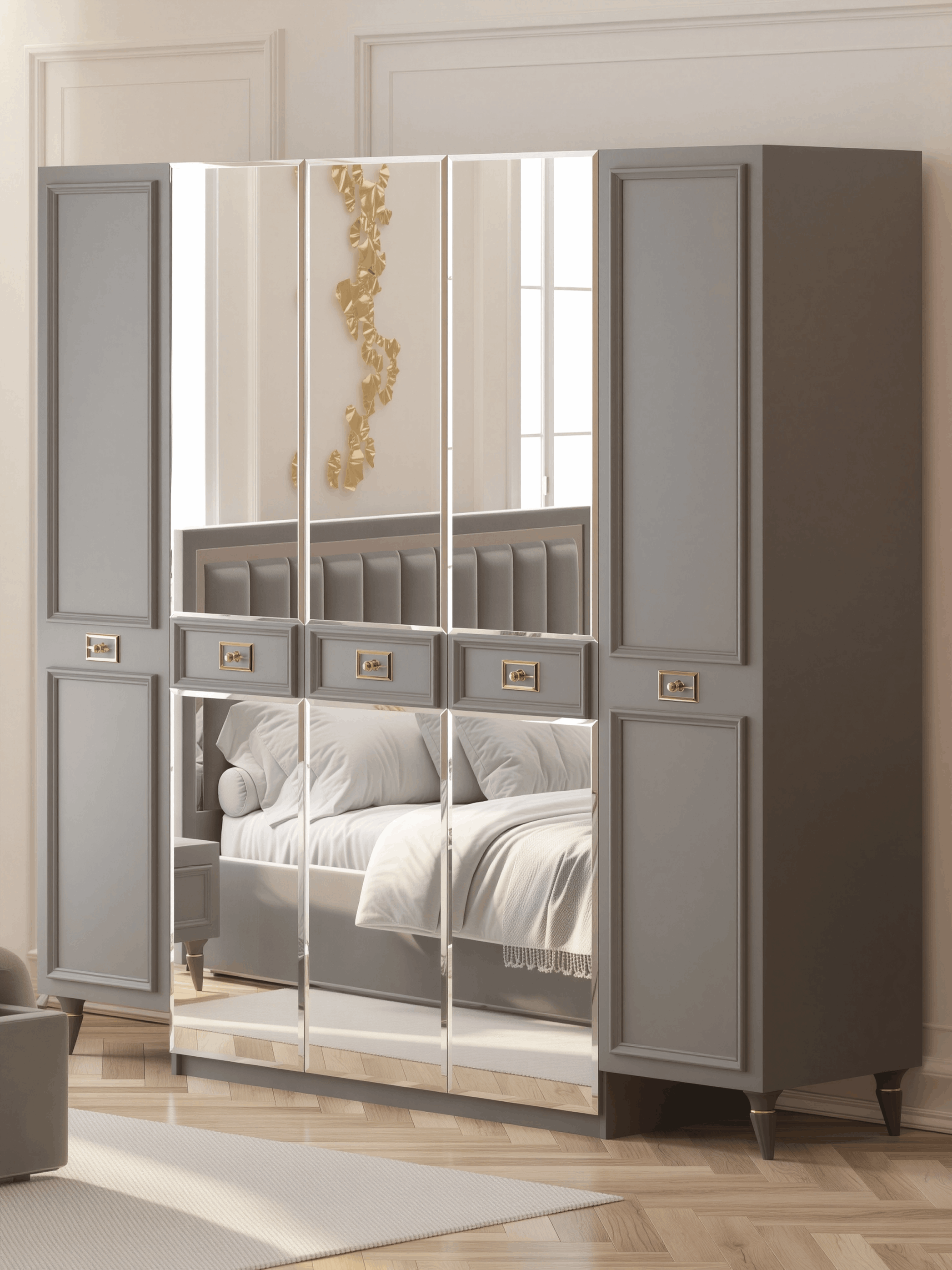 Неоклассический Стиль: С этим шкафом вы возвращаетесь в эпоху изысканных классических форм и изящества. Оригинальный дизайн воплощает в себе лучшие элементы неоклассического стиля, что делает его неотъемлемой частью искусства в вашей спальне.
