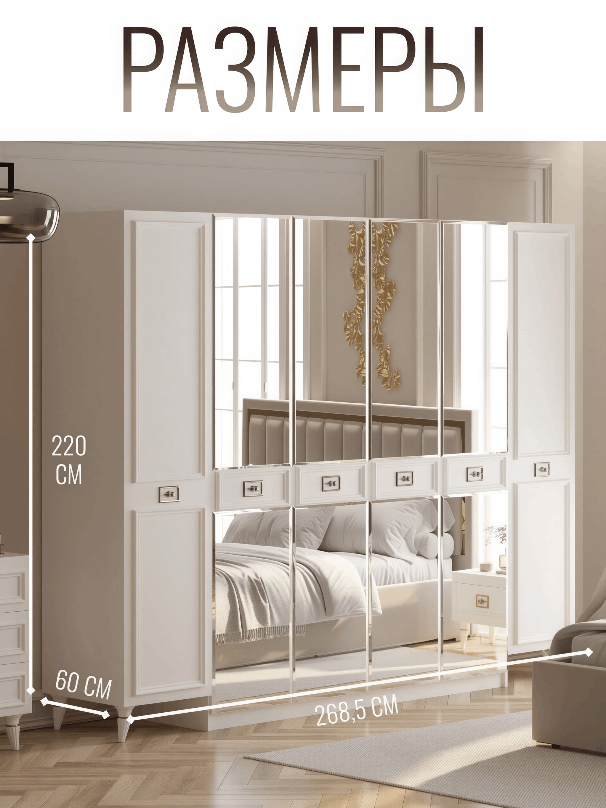 Изысканные Детали: Утонченные линии, резные детали и декоративные элементы создают атмосферу несравненной утонченности и роскоши. Этот шкаф - не просто место для хранения, это произведение искусства, которое придает вашей спальне уникальный характер.