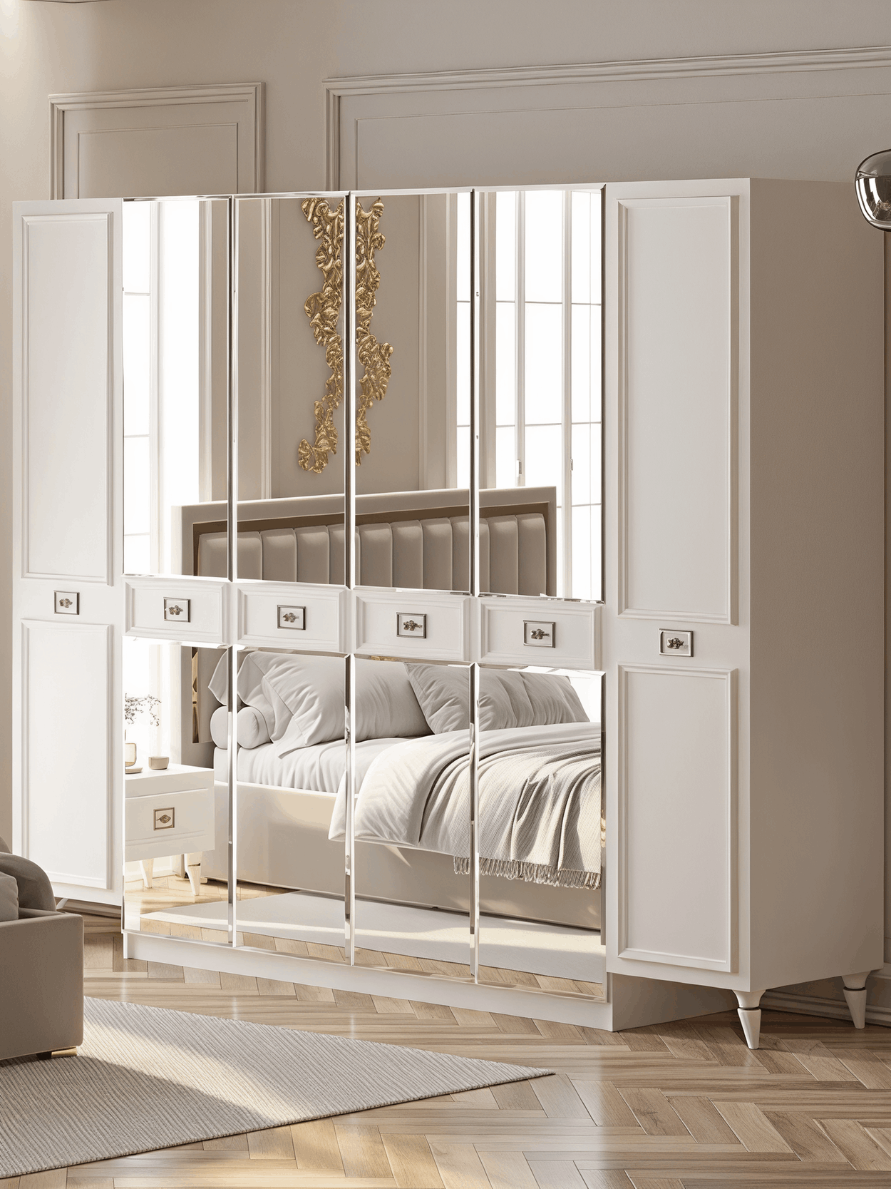 Неоклассический Стиль: С этим шкафом вы возвращаетесь в эпоху изысканных классических форм и изящества. Оригинальный дизайн воплощает в себе лучшие элементы неоклассического стиля, что делает его неотъемлемой частью искусства в вашей спальне.