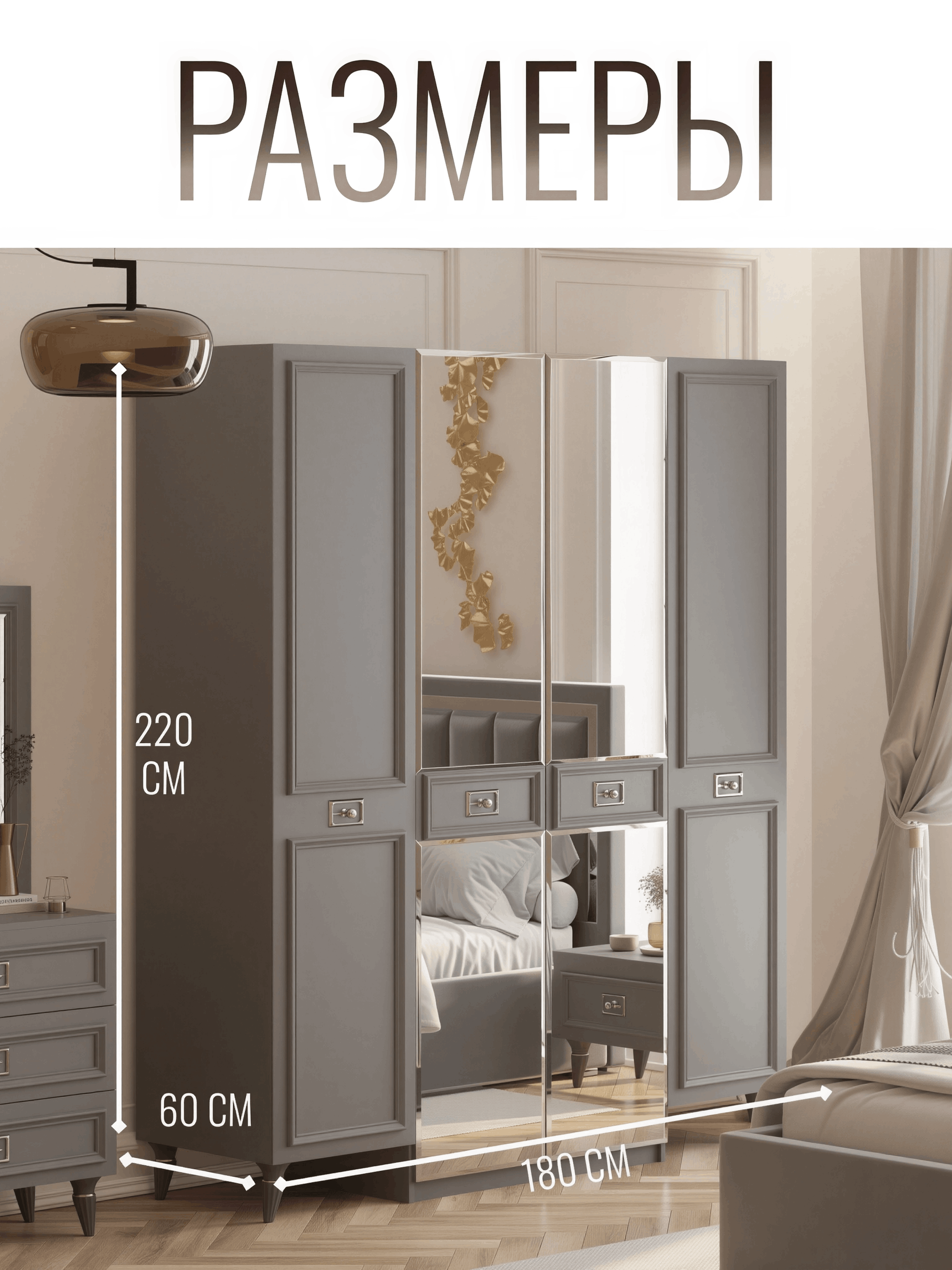 Изысканные Детали: Утонченные линии, резные детали и декоративные элементы создают атмосферу несравненной утонченности и роскоши. Этот шкаф - не просто место для хранения, это произведение искусства, которое придает вашей спальне уникальный характер.