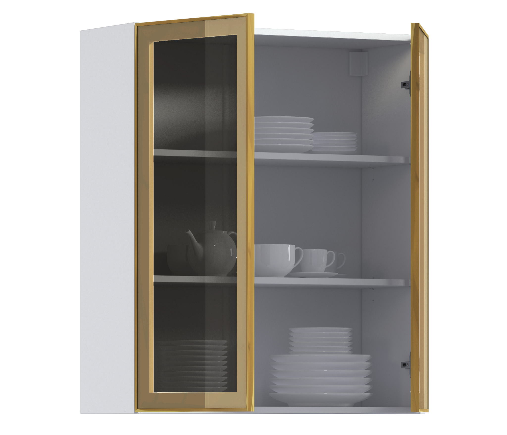 Комплект включает в себя корпус кухонной полки (белого цвета) с необходимой фурнитурой, фасад из алюминиевой рамки золотого цвета и бронзового стекла, а также ручку, соответствующую цвету рамки фасада.