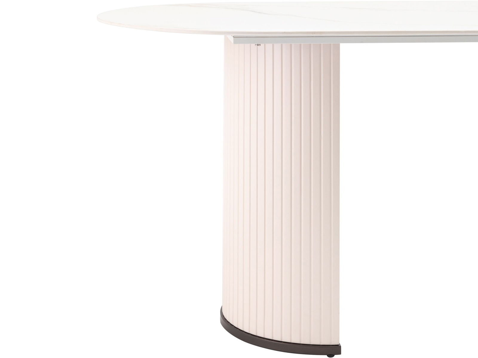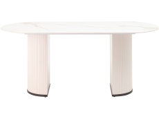 Столешница из керамики отличный вариант для кухни. Материал знаменит прочностью и долговечностью, поверхность устойчива к различным внешним воздействиям. Поверхность столешницы с рисунком белого мрамора гармонично сочетается с массивными ножками бежевого цвета. Простая овальная форма стола позволит легко вписать его в современный интерьер, стол украсит кухню, гостиную или современное кафе, ресторан. Опорные плиссированные ножки в лаконичном дизайне надёжно удерживают всю конструкцию и дополняют монолитный образ. Разрешенная нагрузка до: 120 кг