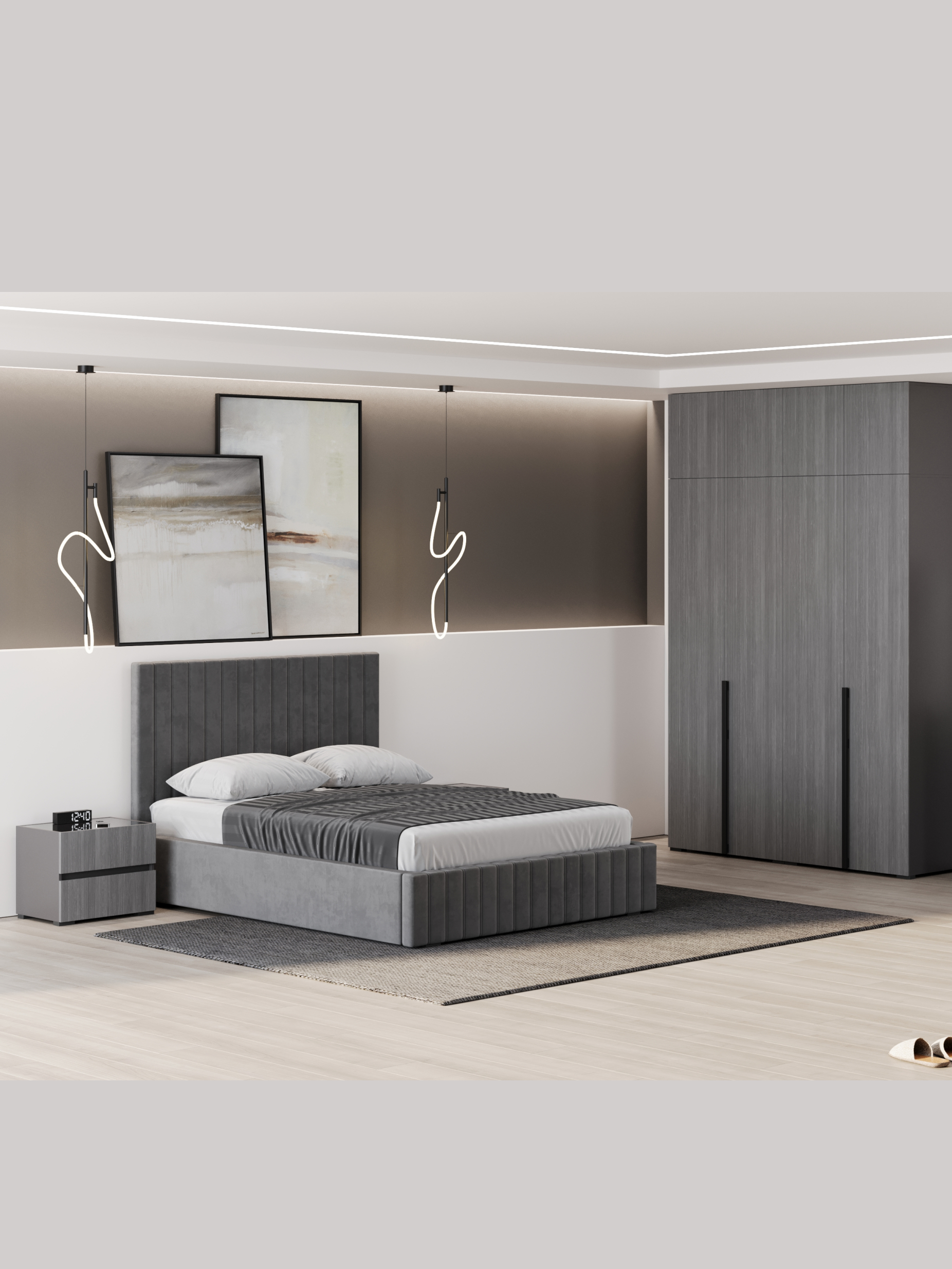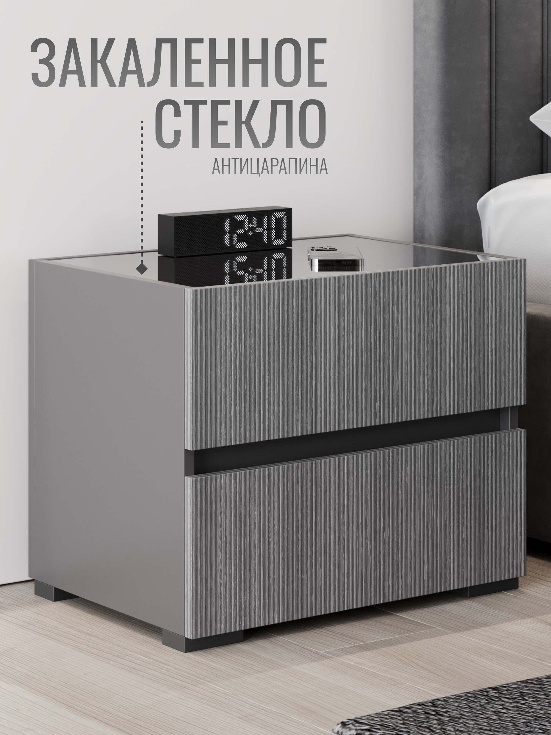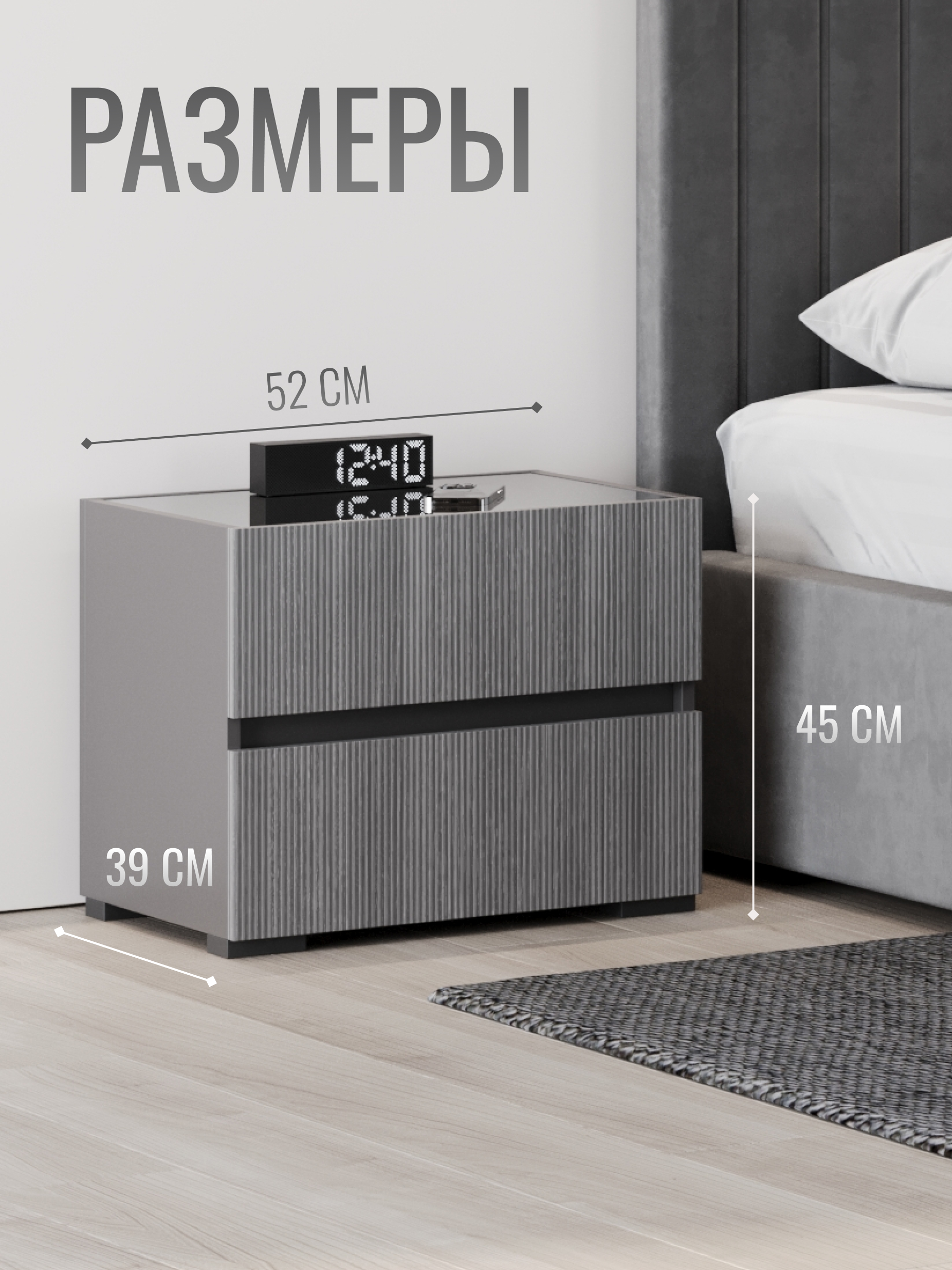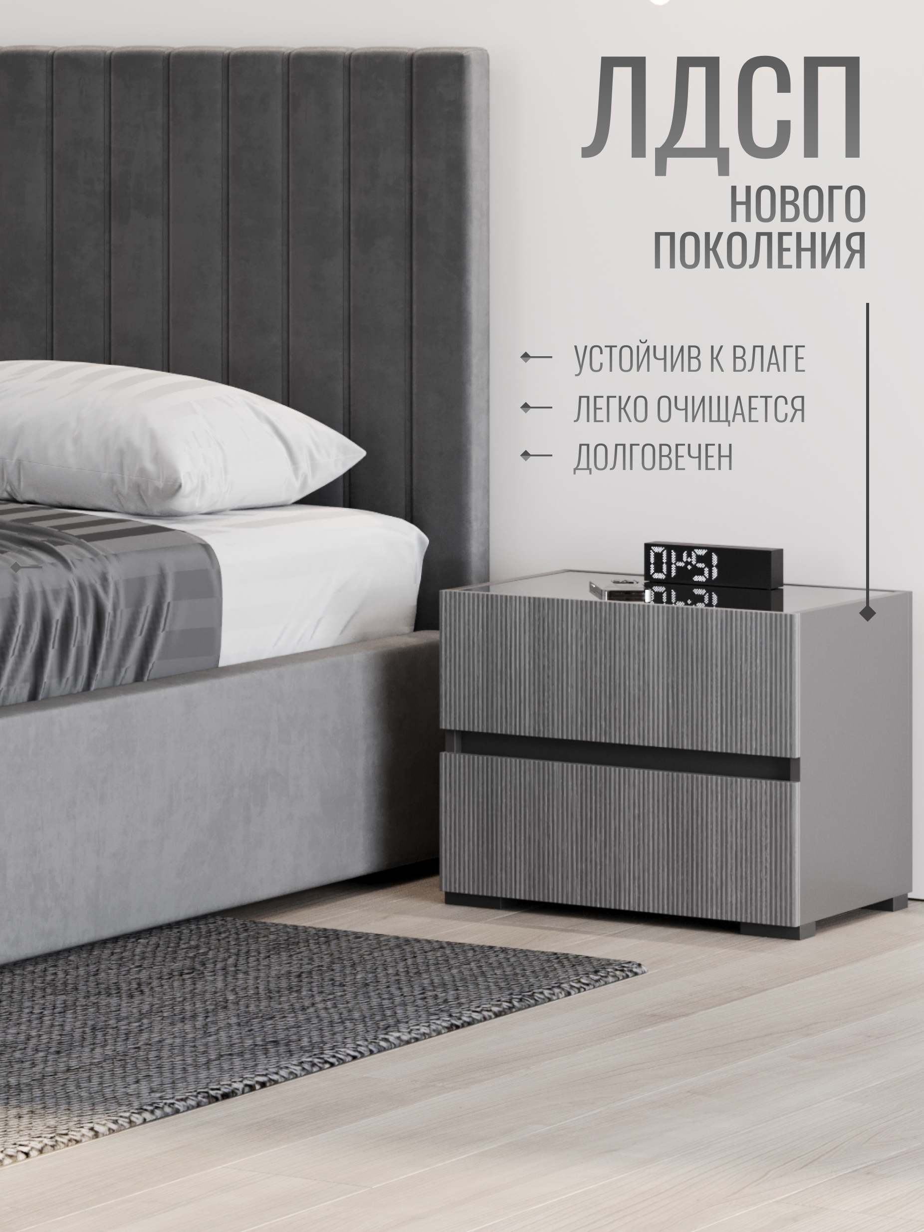 Дизайн тумбы сочетает плавные линии и сдержанные формы, создавая гармонию с любой спальней. Простота и элегантность идеально подчеркивают современный минимализм, а нейтральные оттенки легко вписываются в интерьер, добавляя ему легкости и изысканности.