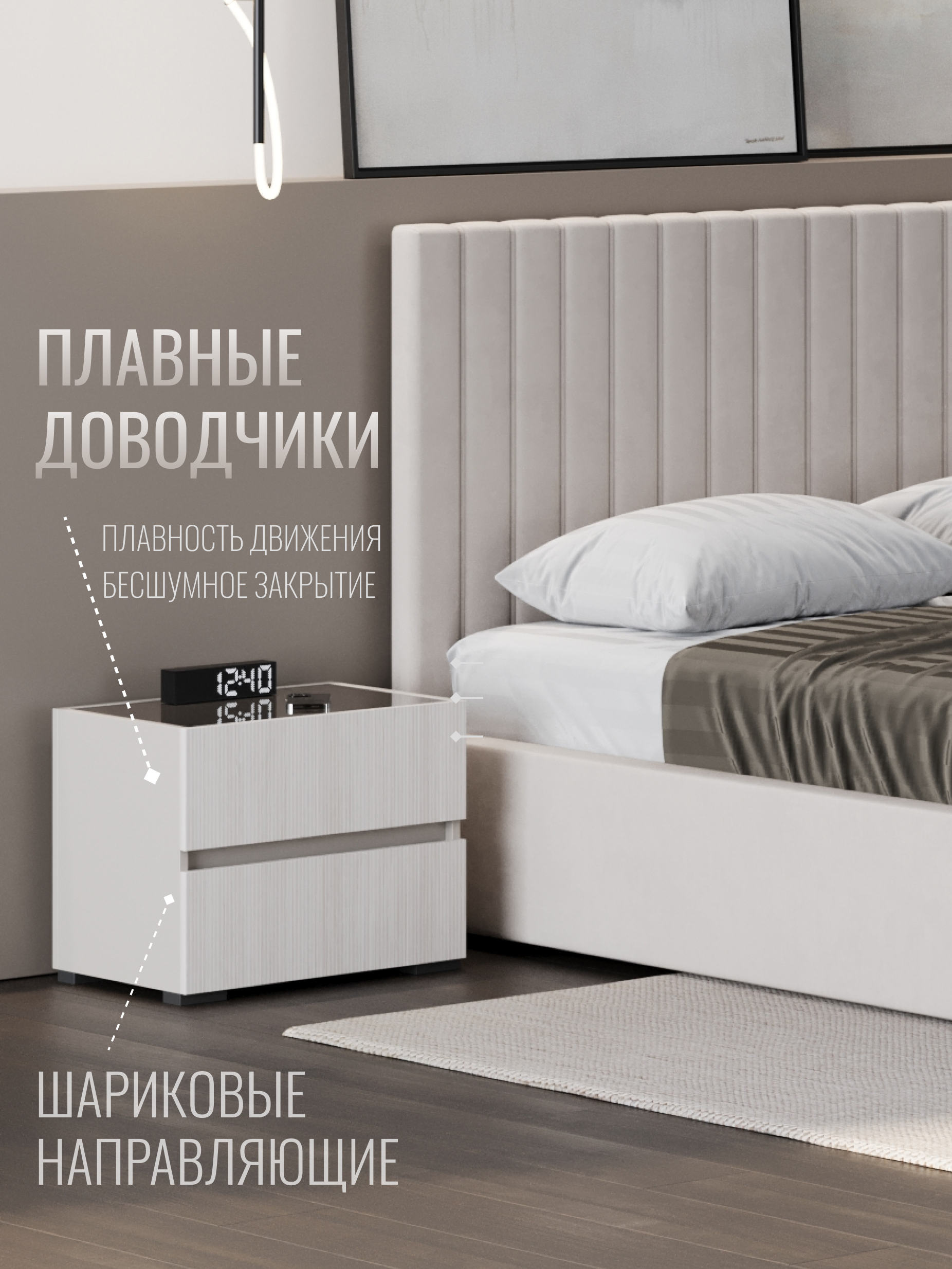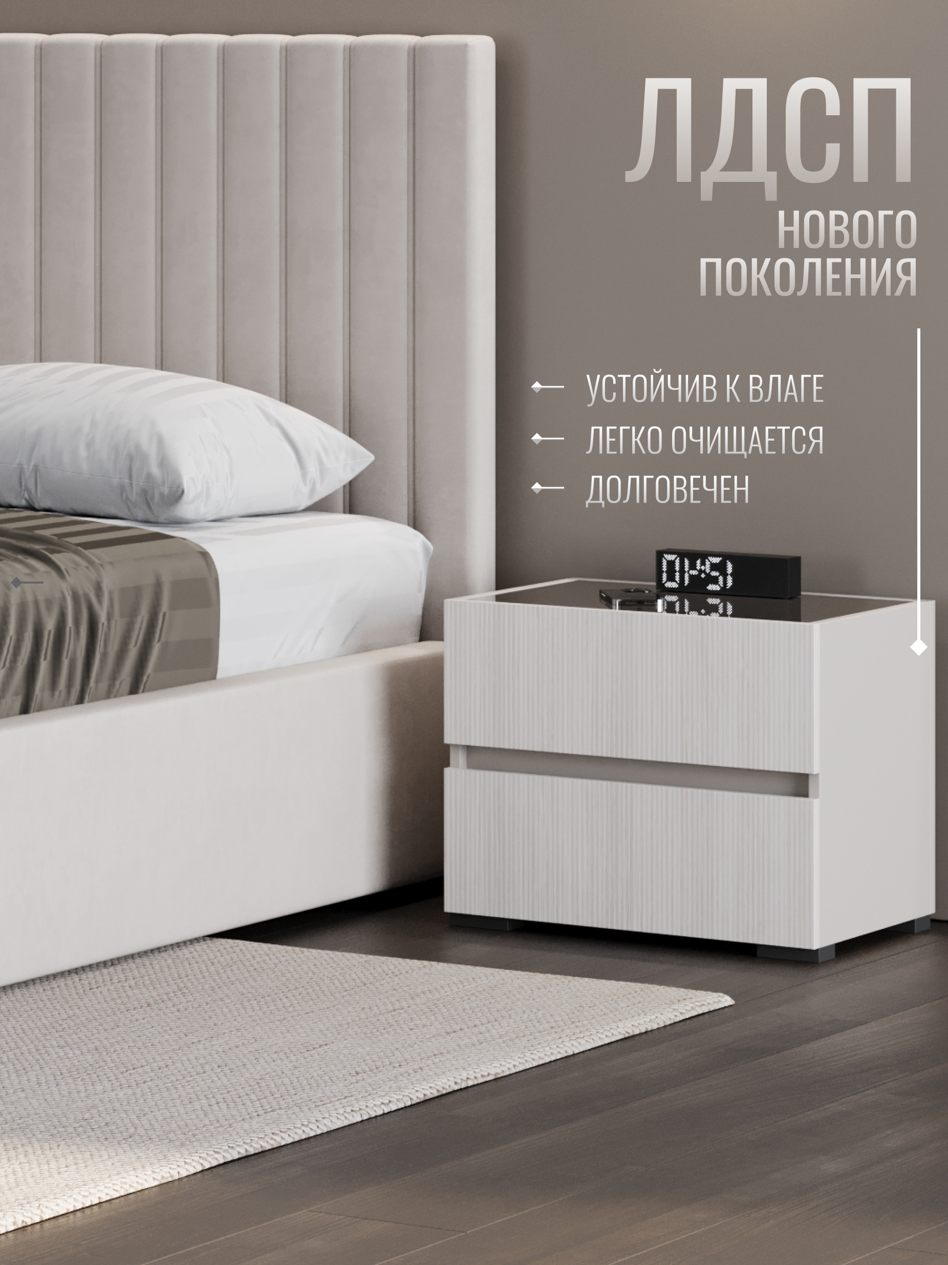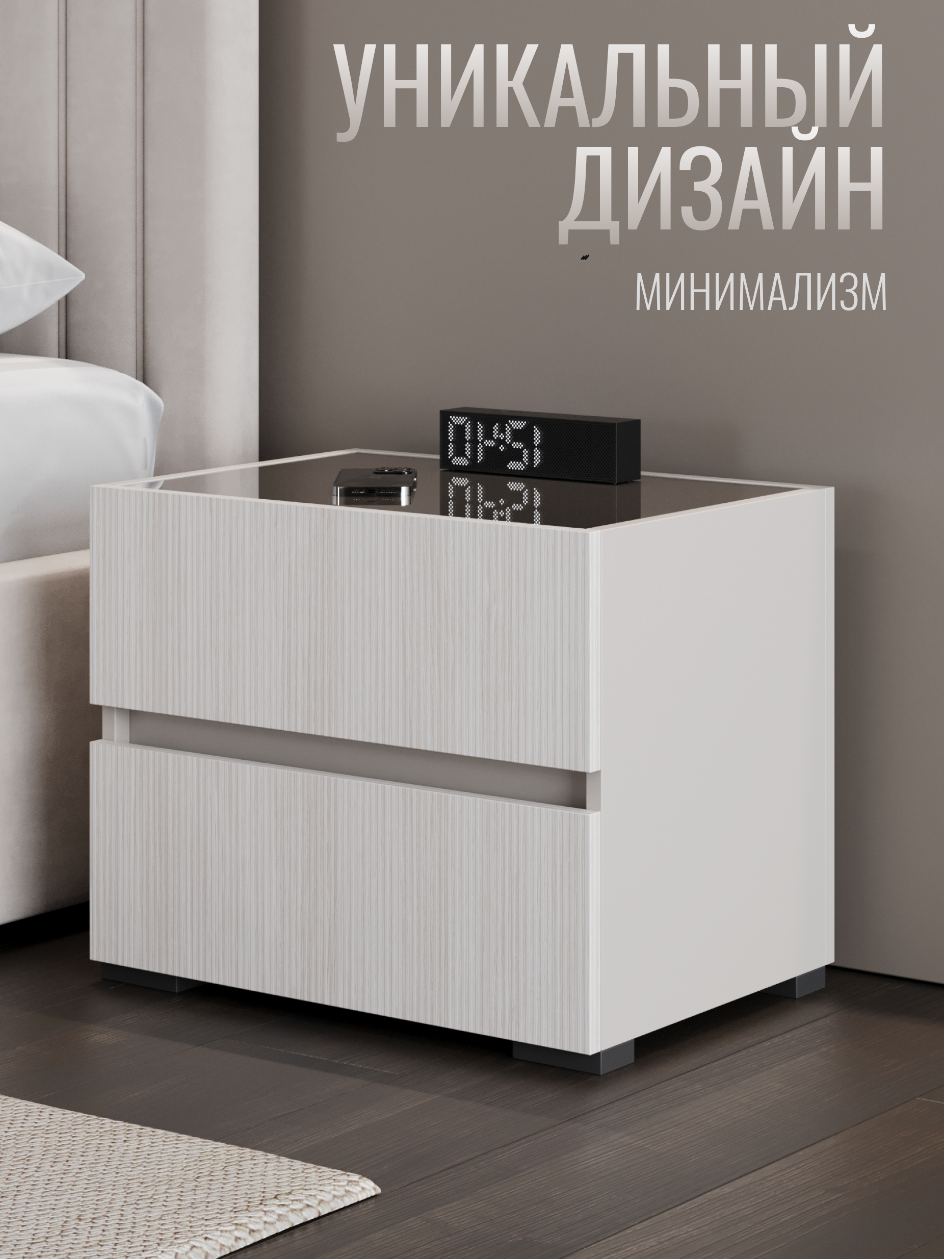 Дизайн тумбы сочетает плавные линии и сдержанные формы, создавая гармонию с любой спальней. Простота и элегантность идеально подчеркивают современный минимализм, а нейтральные оттенки легко вписываются в интерьер, добавляя ему легкости и изысканности.