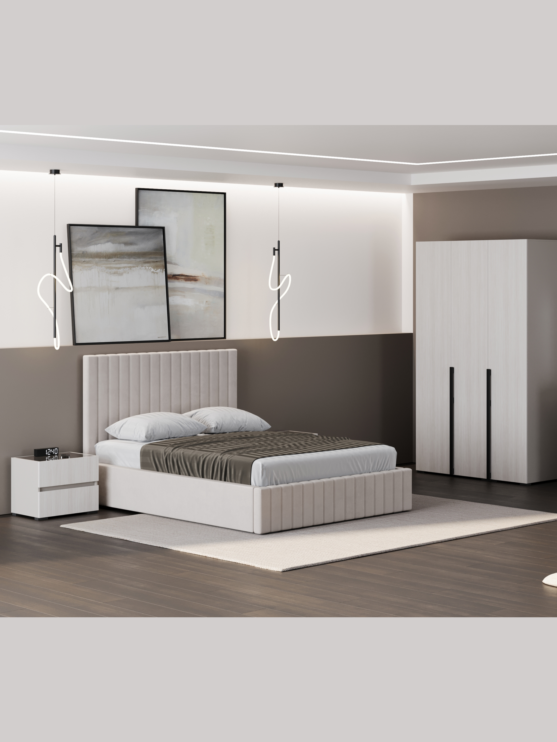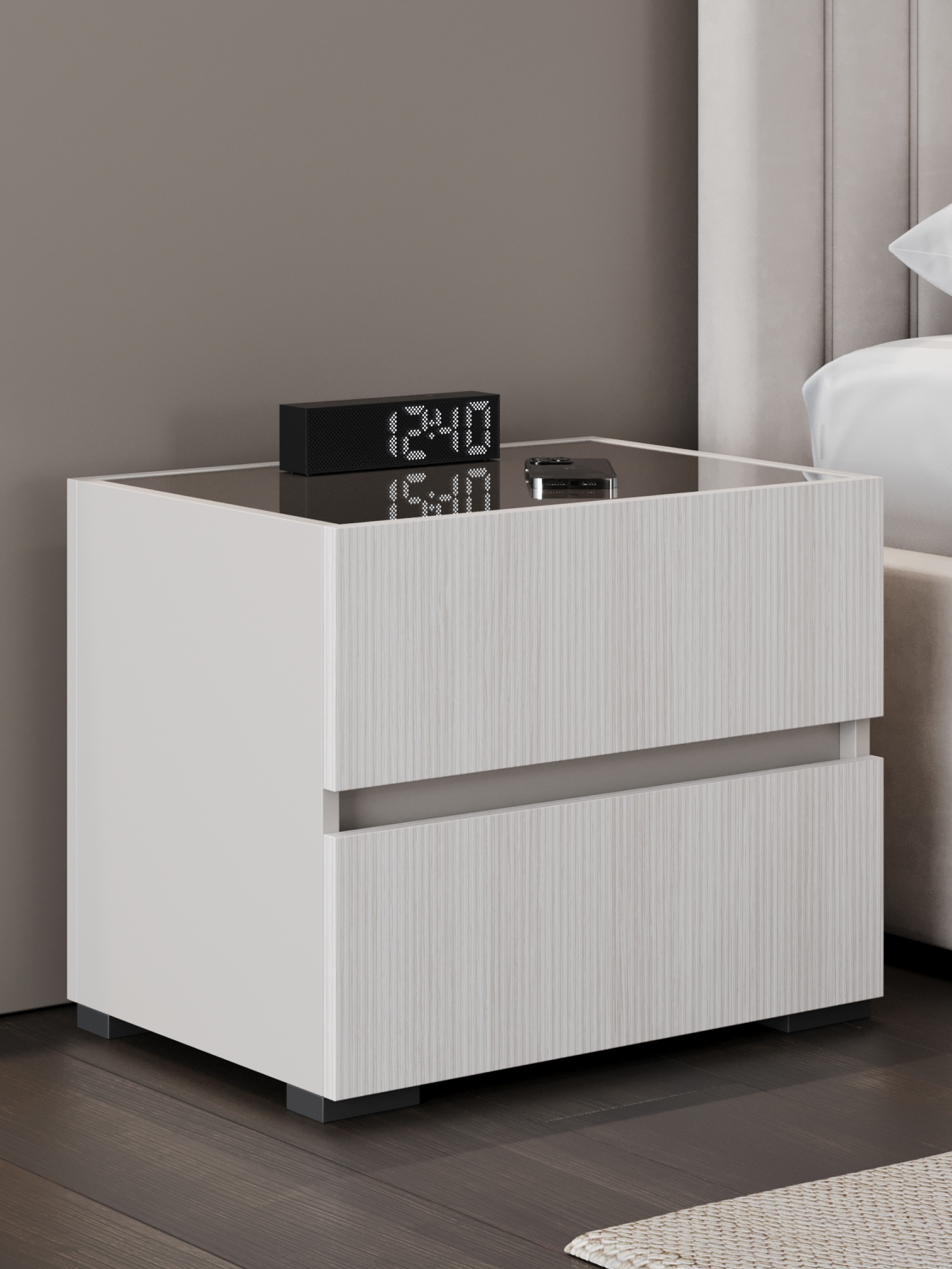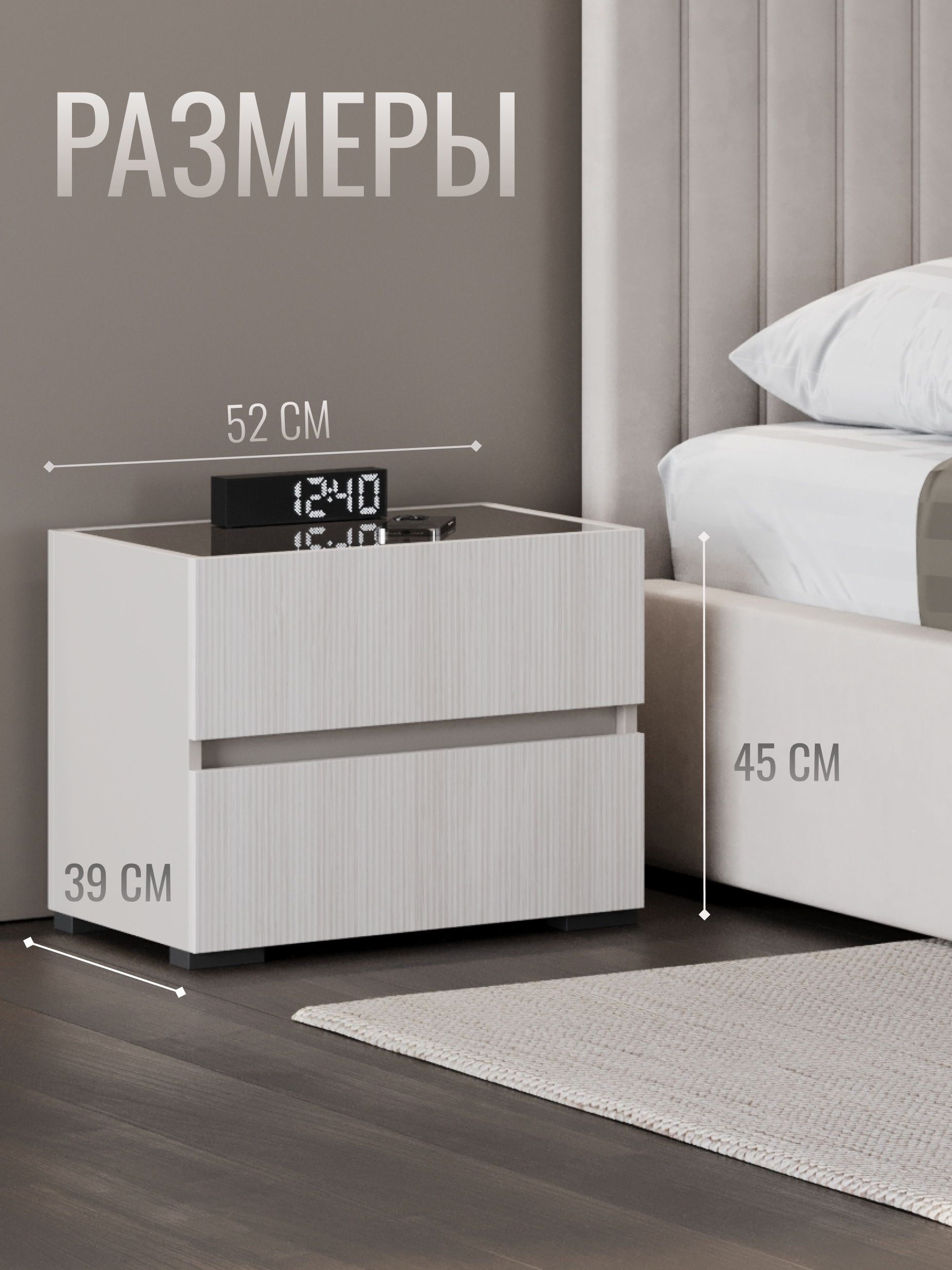 Дизайн тумбы сочетает плавные линии и сдержанные формы, создавая гармонию с любой спальней. Простота и элегантность идеально подчеркивают современный минимализм, а нейтральные оттенки легко вписываются в интерьер, добавляя ему легкости и изысканности.