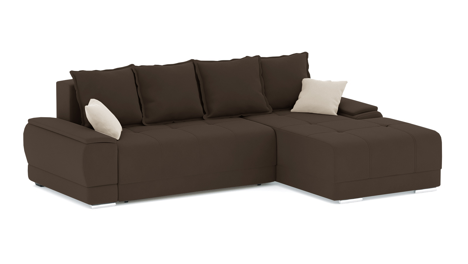 Механизм трансформации еврокнижка. Каркас ДСП, ДВП, ЛДСП, фанера, брус хвойных пород. Спальное место 1900х1330мм. Наполнение высокоэластичный ППУ. Ящик для белья есть. Наполнение подушек-крошка ППУ. Высота сиденья от пола 430мм. Глубина сиденья без подушек 720мм. В комплекте 4 большие подушеки и 2 декоративные.