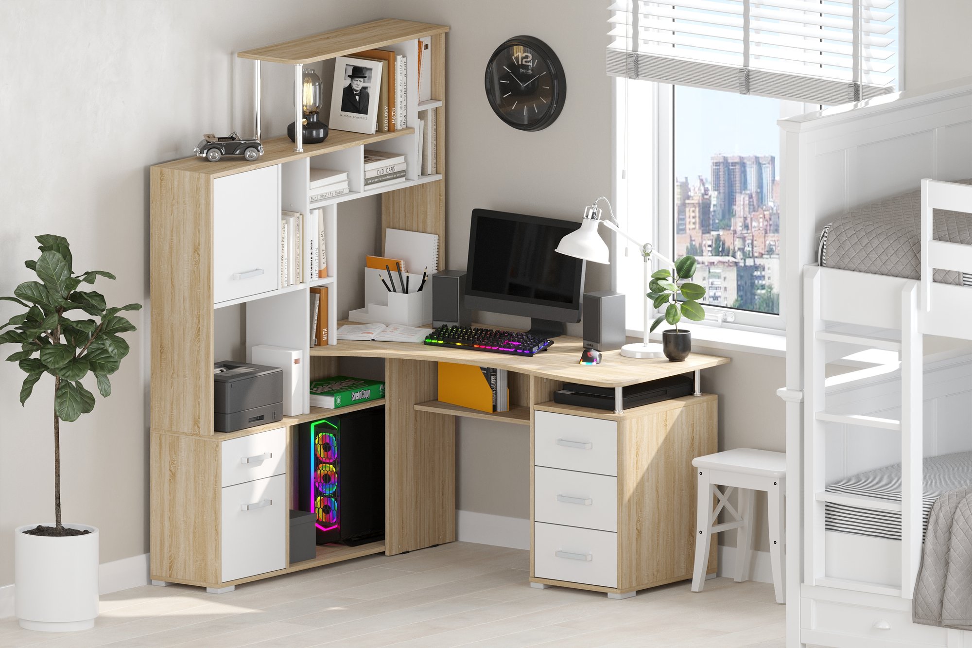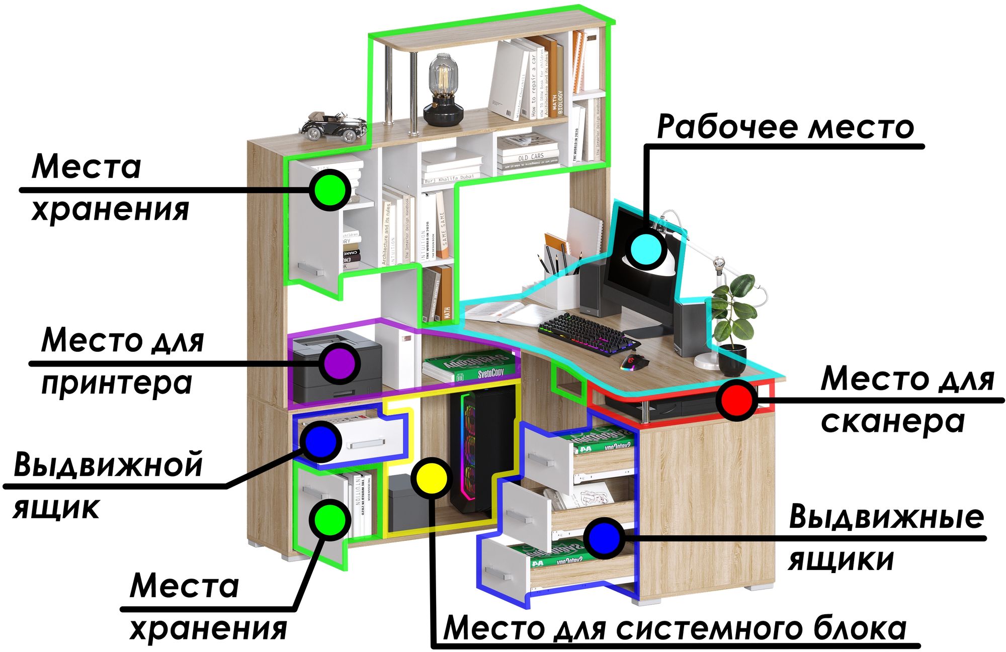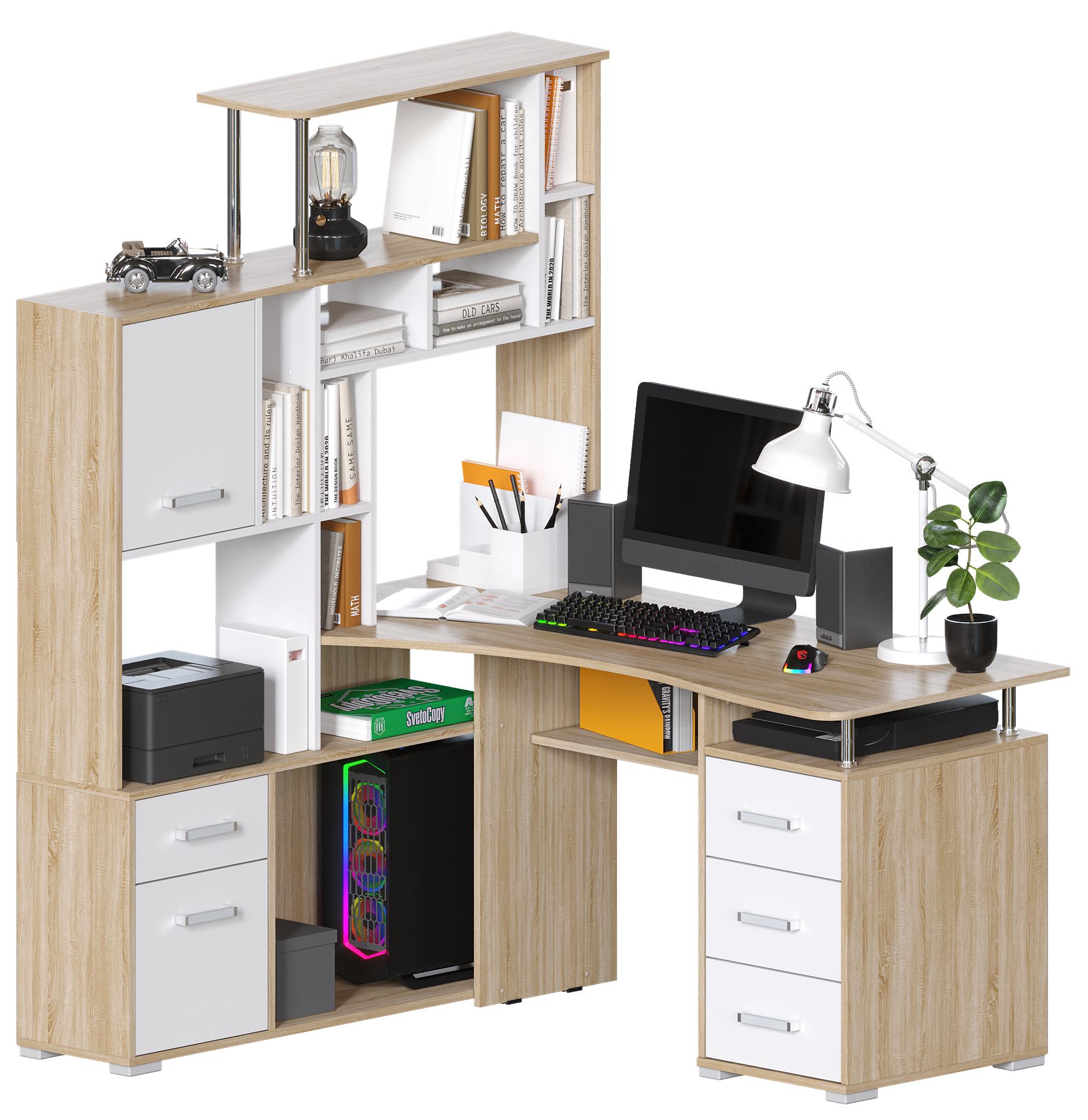 Большой угловой компьютерный стол с эргономичной столешницей и множеством мест для хранения: полочки, ящики. Сборка возможна только так как на картинке. Поставляется в разобранном виде.