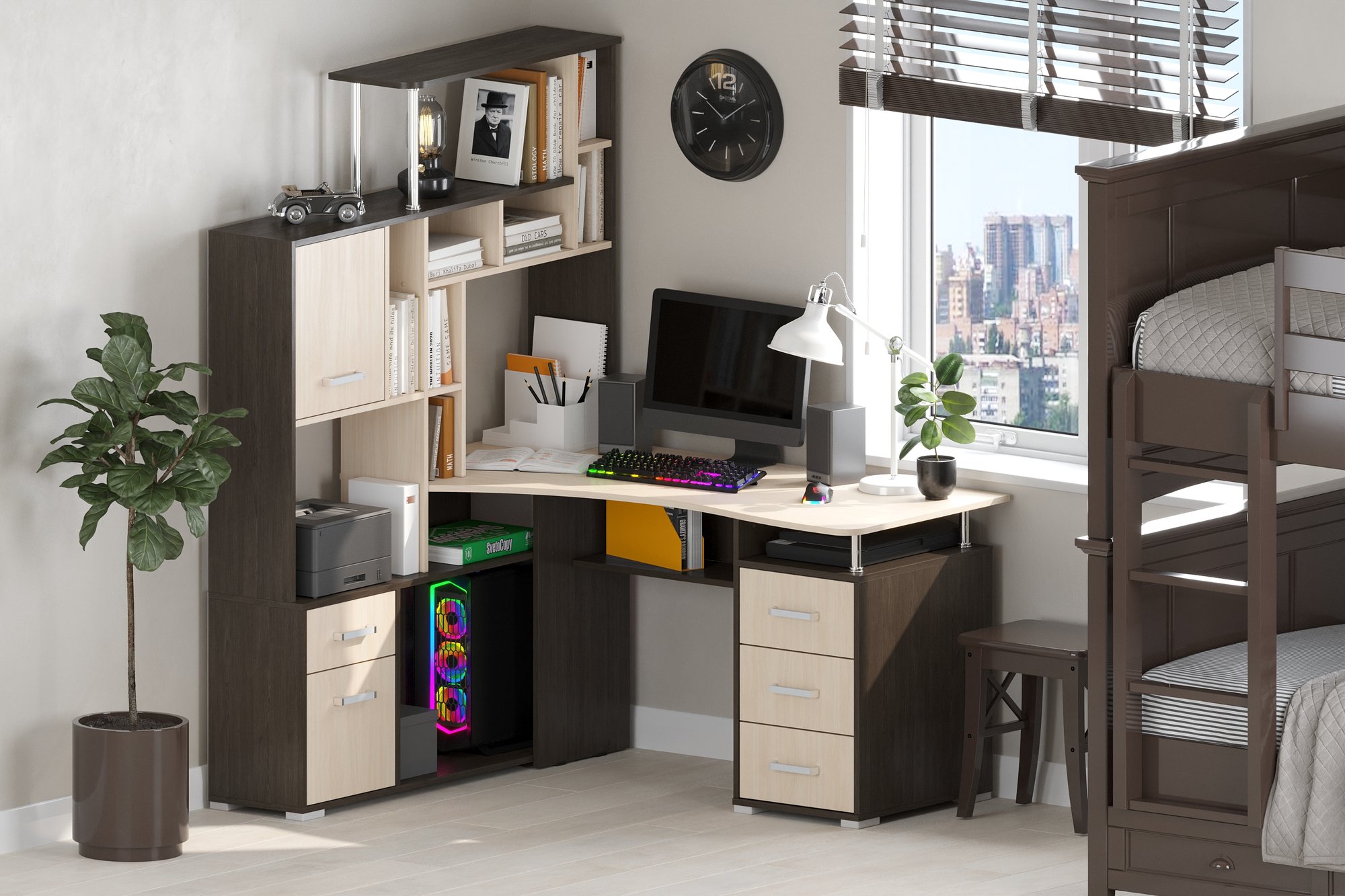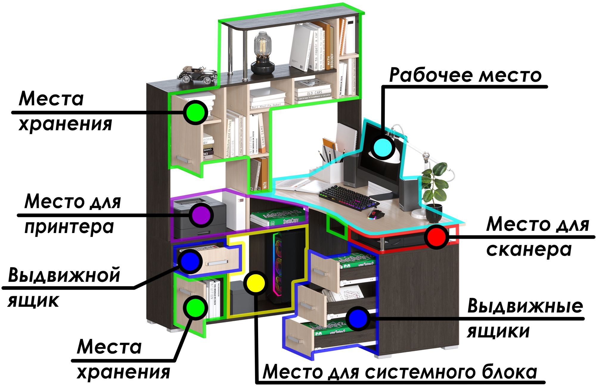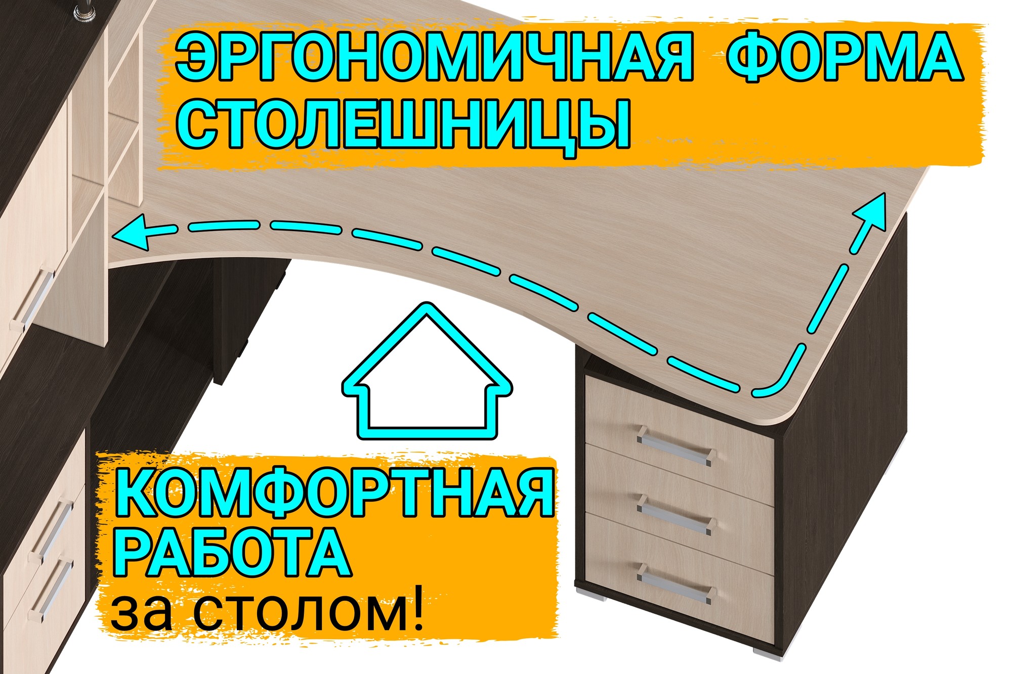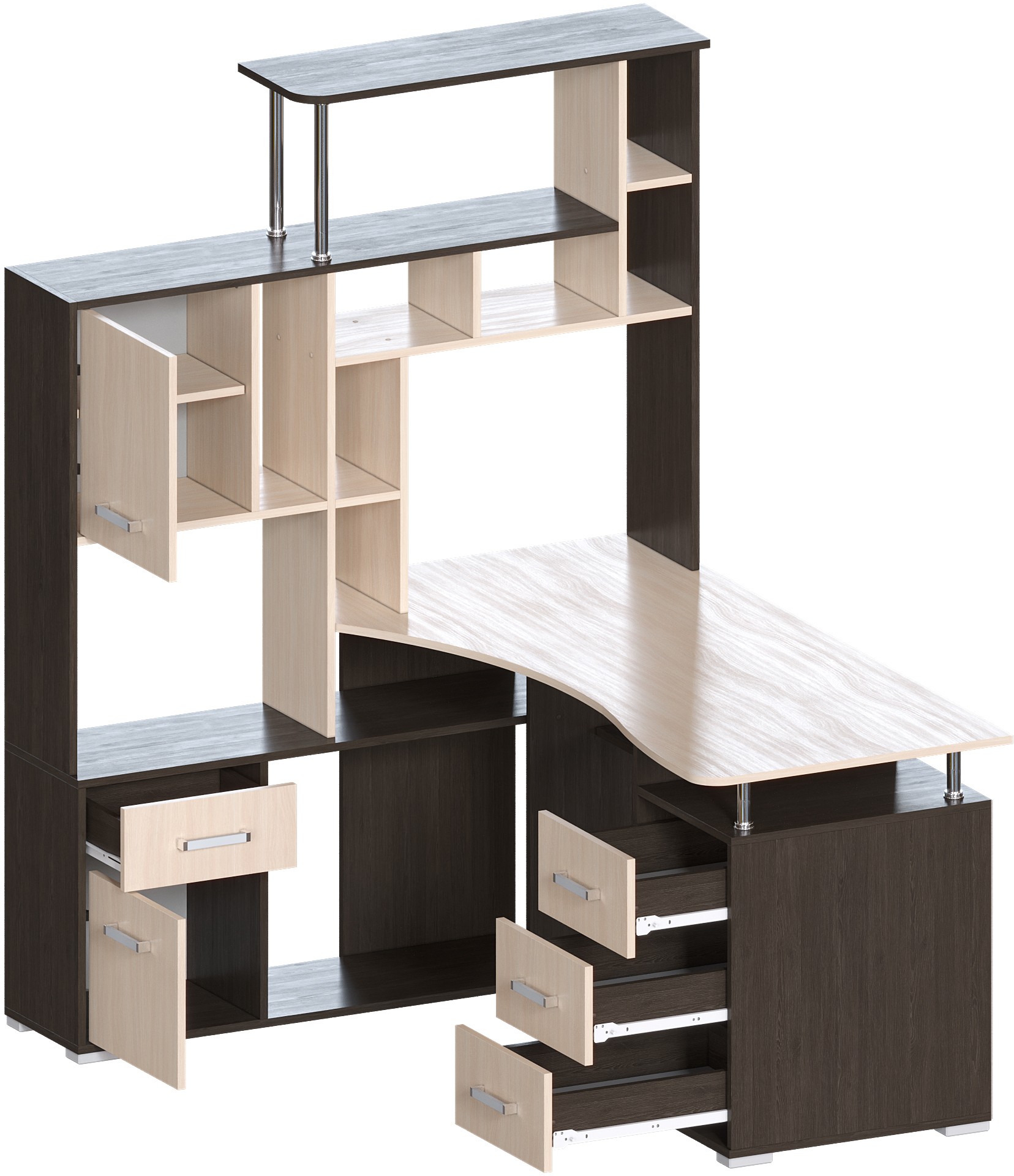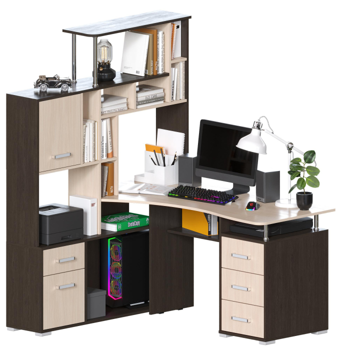 Большой угловой компьютерный стол с эргономичной столешницей и множеством мест для хранения: полочки, ящики. Сборка возможна только так как на картинке. Поставляется в разобранном виде.