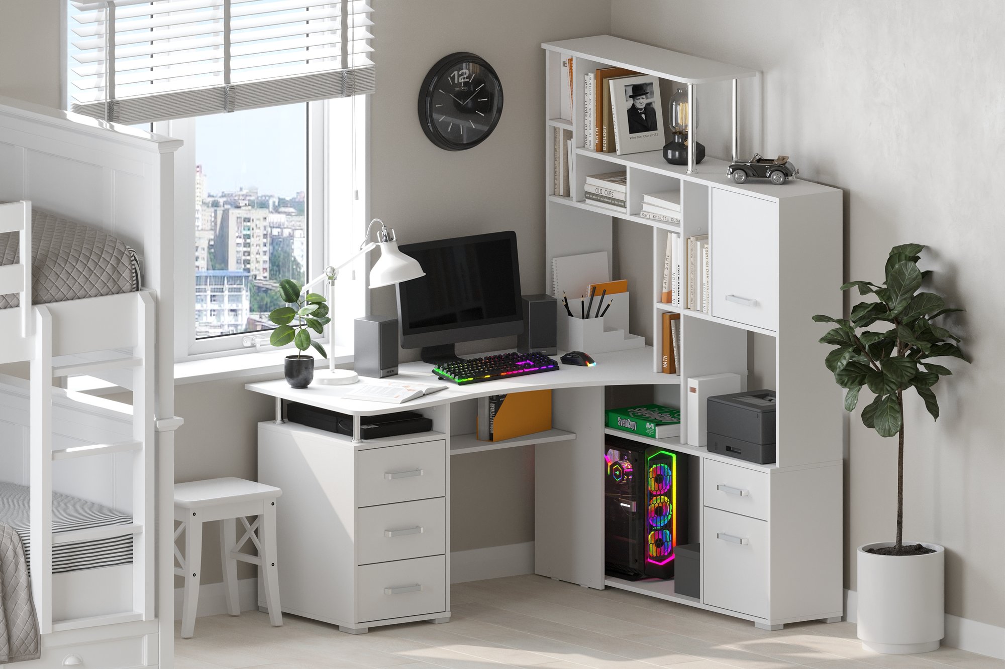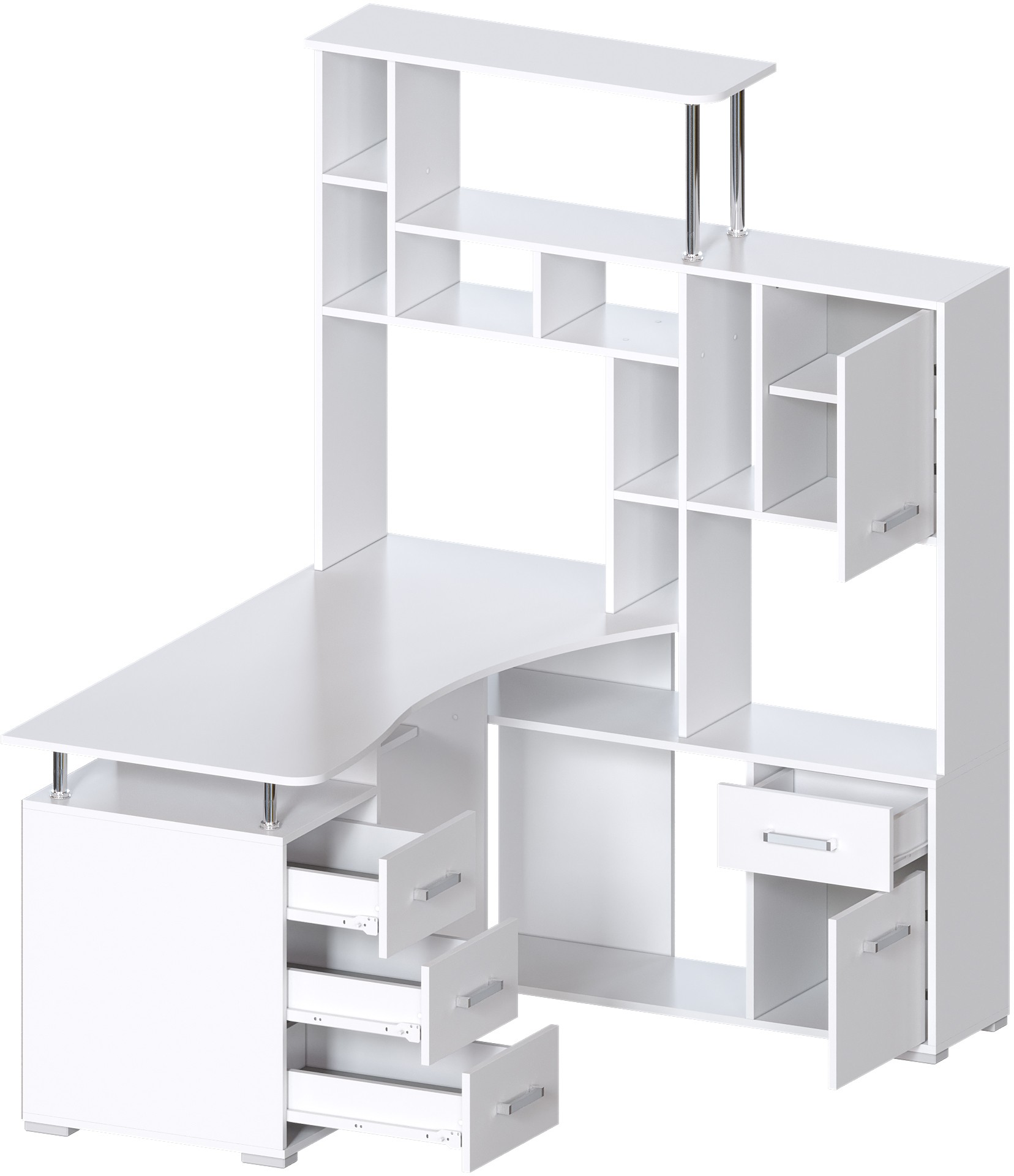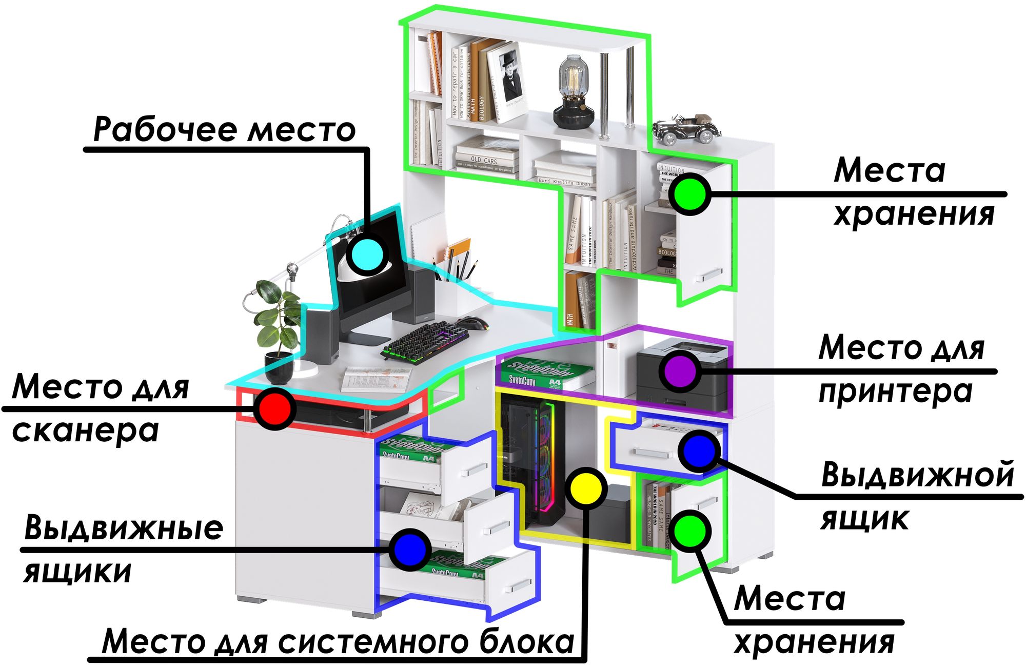 Большой угловой компьютерный стол с эргономичной столешницей и множеством мест для хранения: полочки, ящики. Сборка возможна только так как на картинке. Поставляется в разобранном виде.