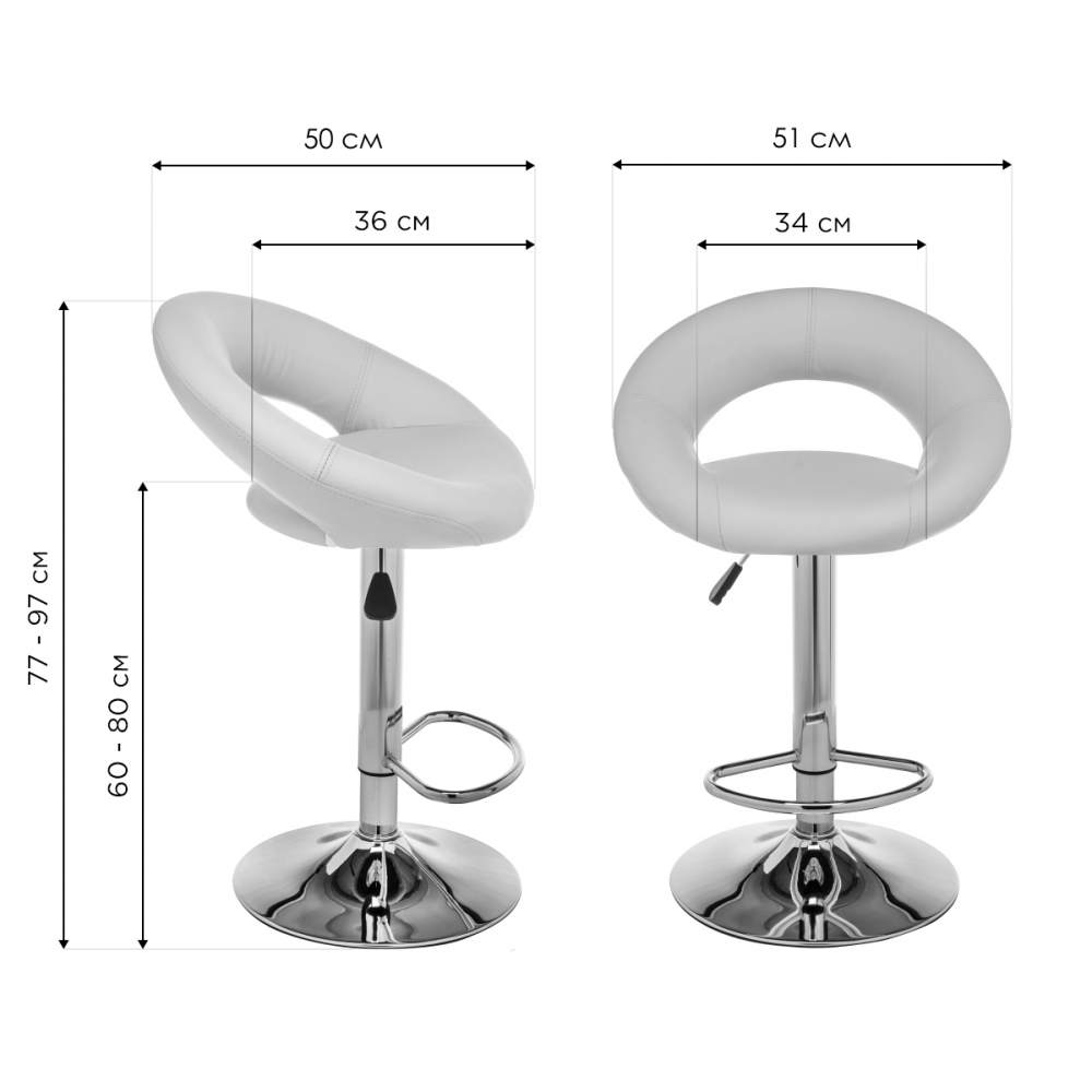 Внимание! Барный стул поставляется без декоративного кольца у основания. Материал каркаса - Хромированный металл; Материал обивки - Кожзаменитель или велюр; Цвет ножек - Хромированный металл каркас; Ширина - 51; Глубина - 46; Высота - 80; Глубина сиденья - 36; Высота сиденья - 59; Высота сиденья максимальная - 80,5; Высота максимальная - 101,5.
