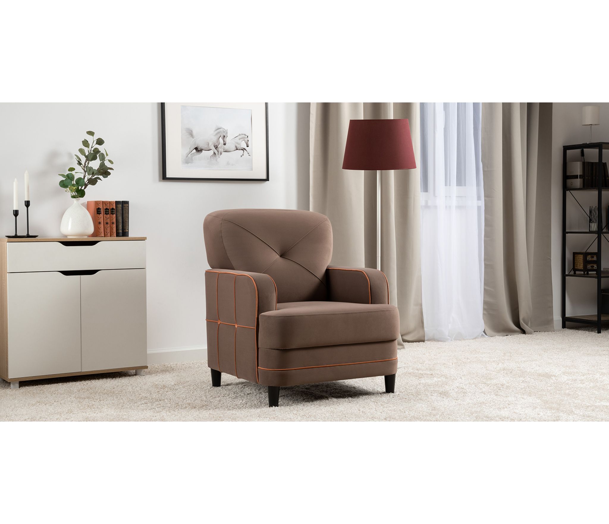 По торцам подлокотников и думках контрастный декоративный кант. Защипы на сиденье и подушке.