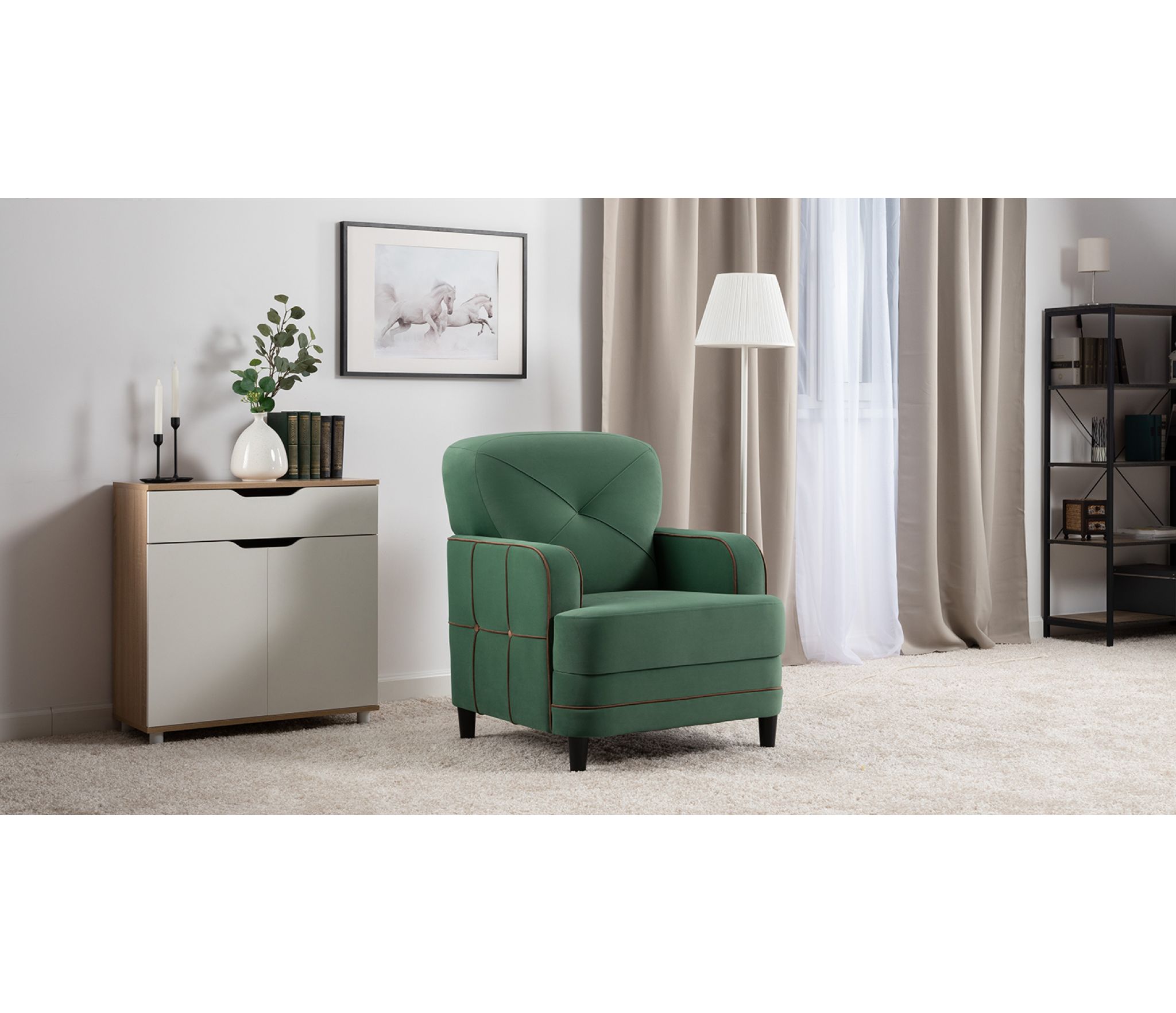 По торцам подлокотников и думках контрастный декоративный кант. Защипы на сиденье и подушке.