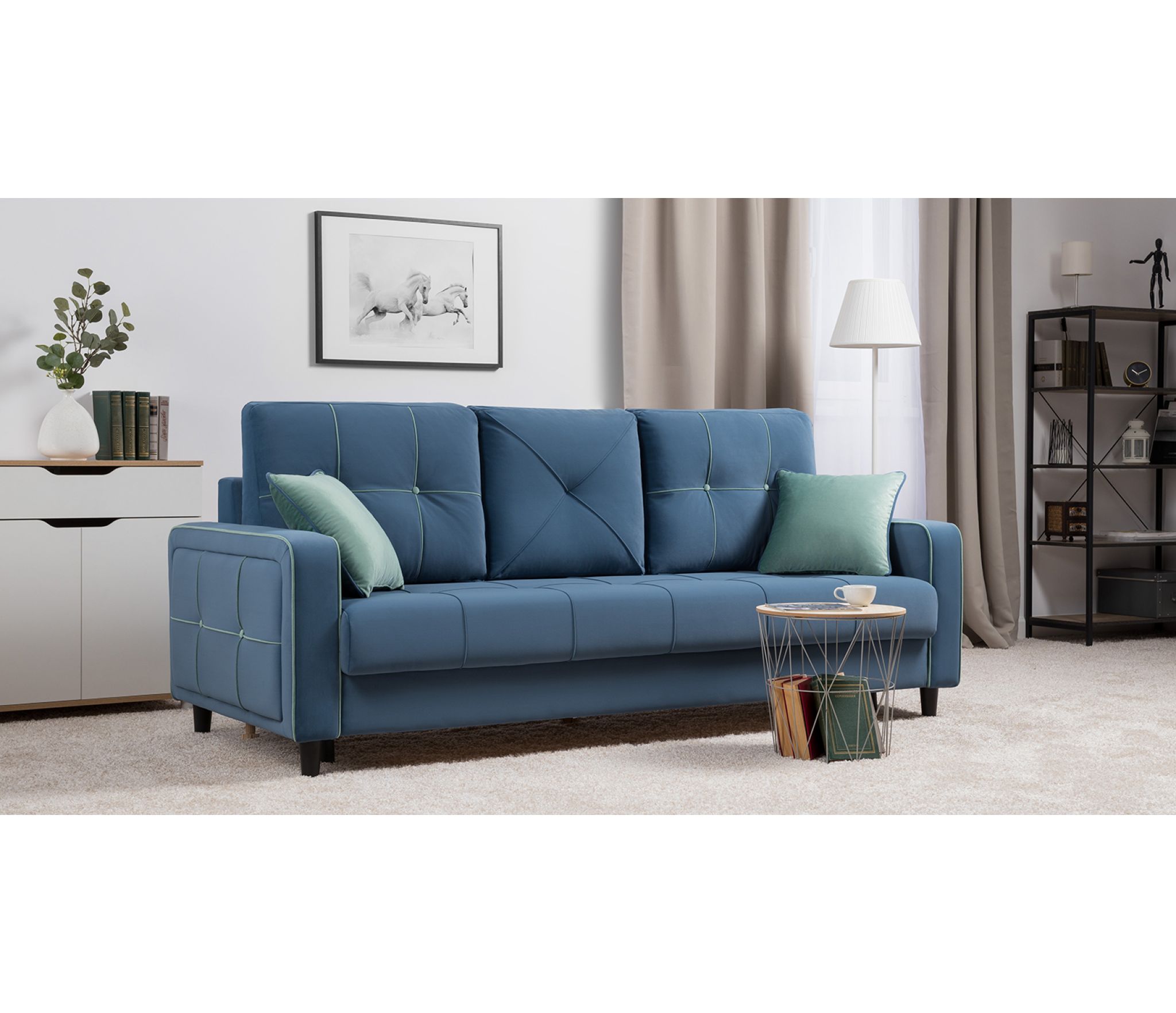 Контрастные канты, пуговицы и декоративные подушки делают этот диван ярким акцентом интерьера.