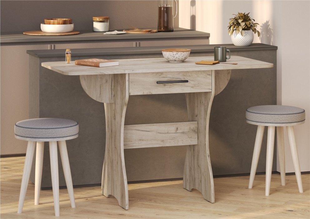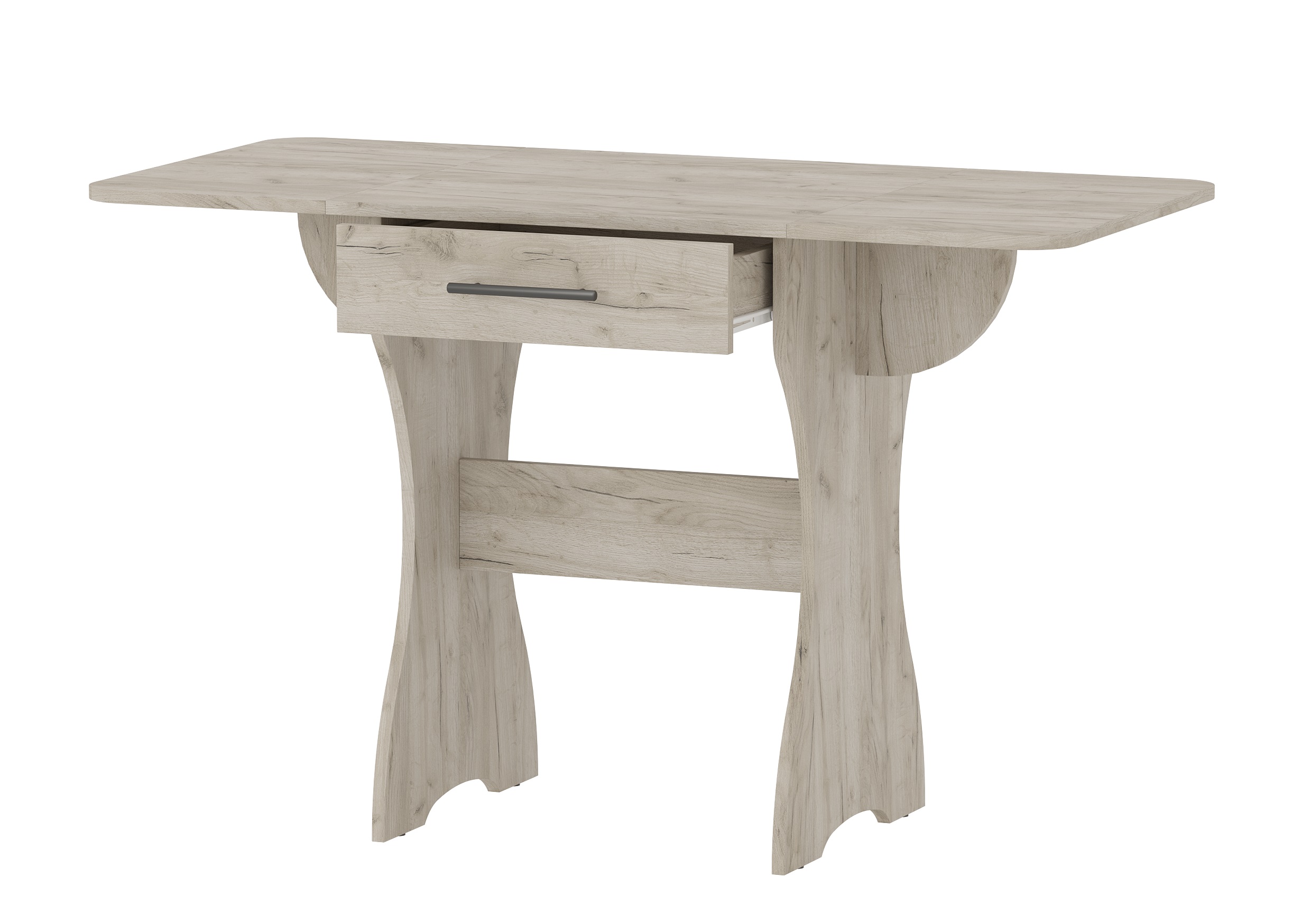 Удобный раскладной кухонный стол с выдвижным ящиком — идеальное решение для компактных и функциональных интерьеров. Надёжная модульная конструкция позволяет быстро трансформировать столешницу: в сложенном виде он занимает всего 600 мм длины, а при необходимости раскладывается до 1200 мм. Под столешницей расположен вместительный выдвижной ящик, в котором можно хранить мелкую кухонную утварь или текстиль.