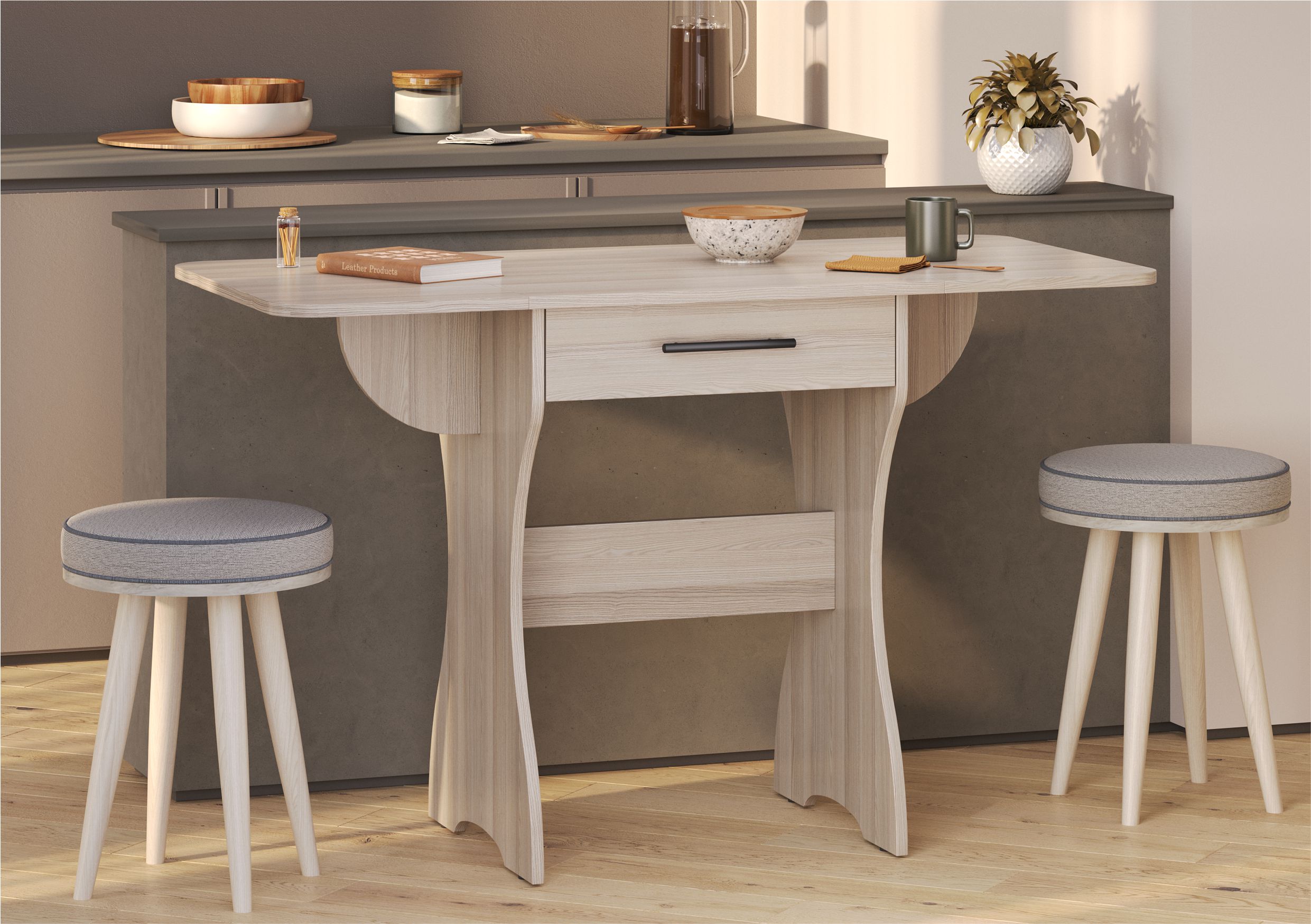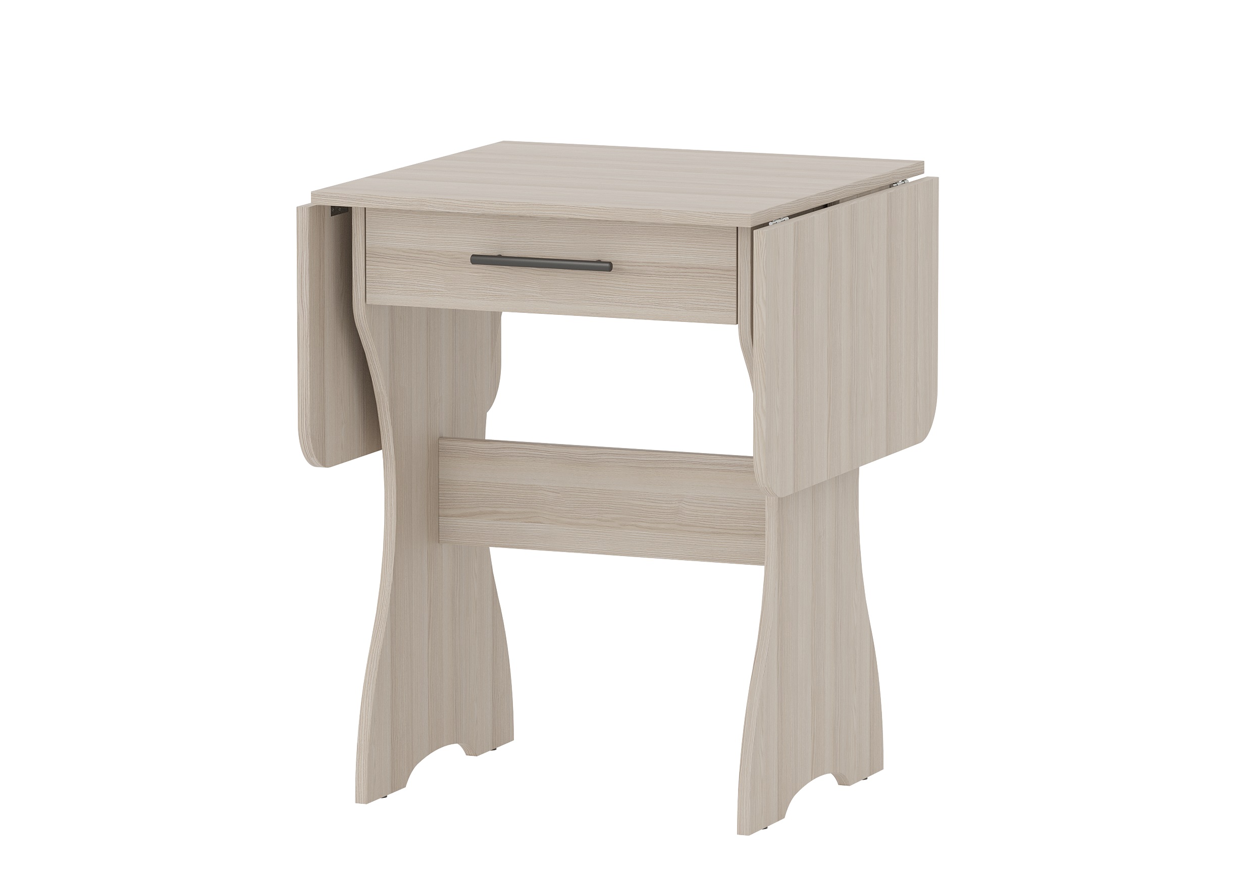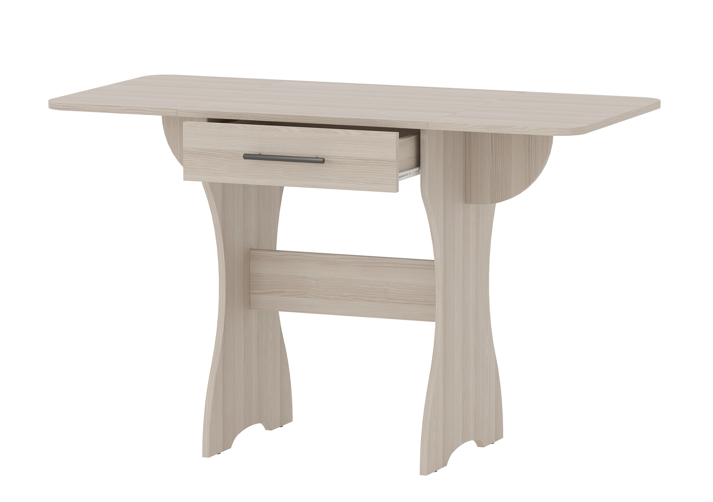 Удобный раскладной кухонный стол с выдвижным ящиком — идеальное решение для компактных и функциональных интерьеров. Надёжная модульная конструкция позволяет быстро трансформировать столешницу: в сложенном виде он занимает всего 600 мм длины, а при необходимости раскладывается до 1200 мм. Под столешницей расположен вместительный выдвижной ящик, в котором можно хранить мелкую кухонную утварь или текстиль.