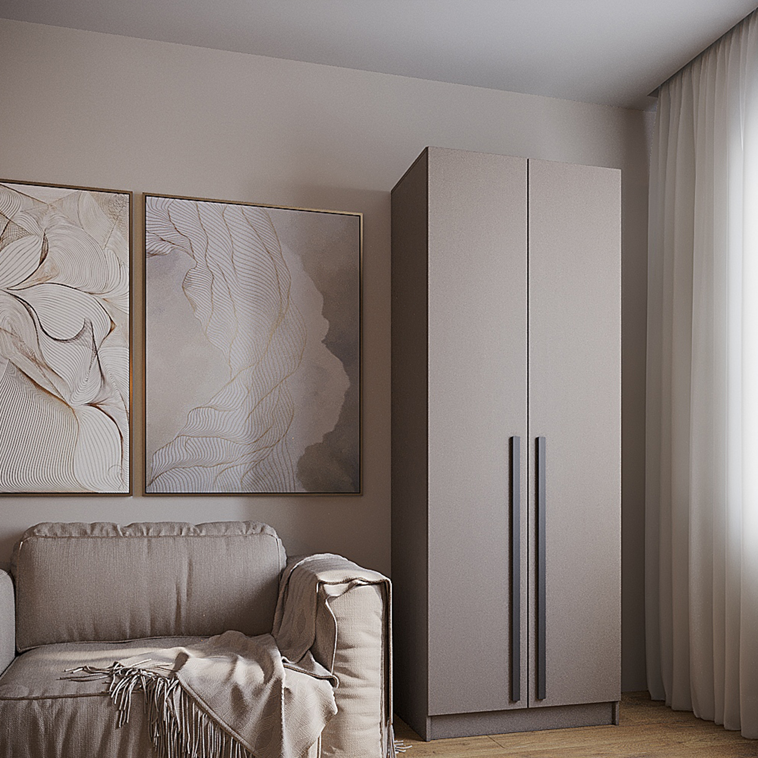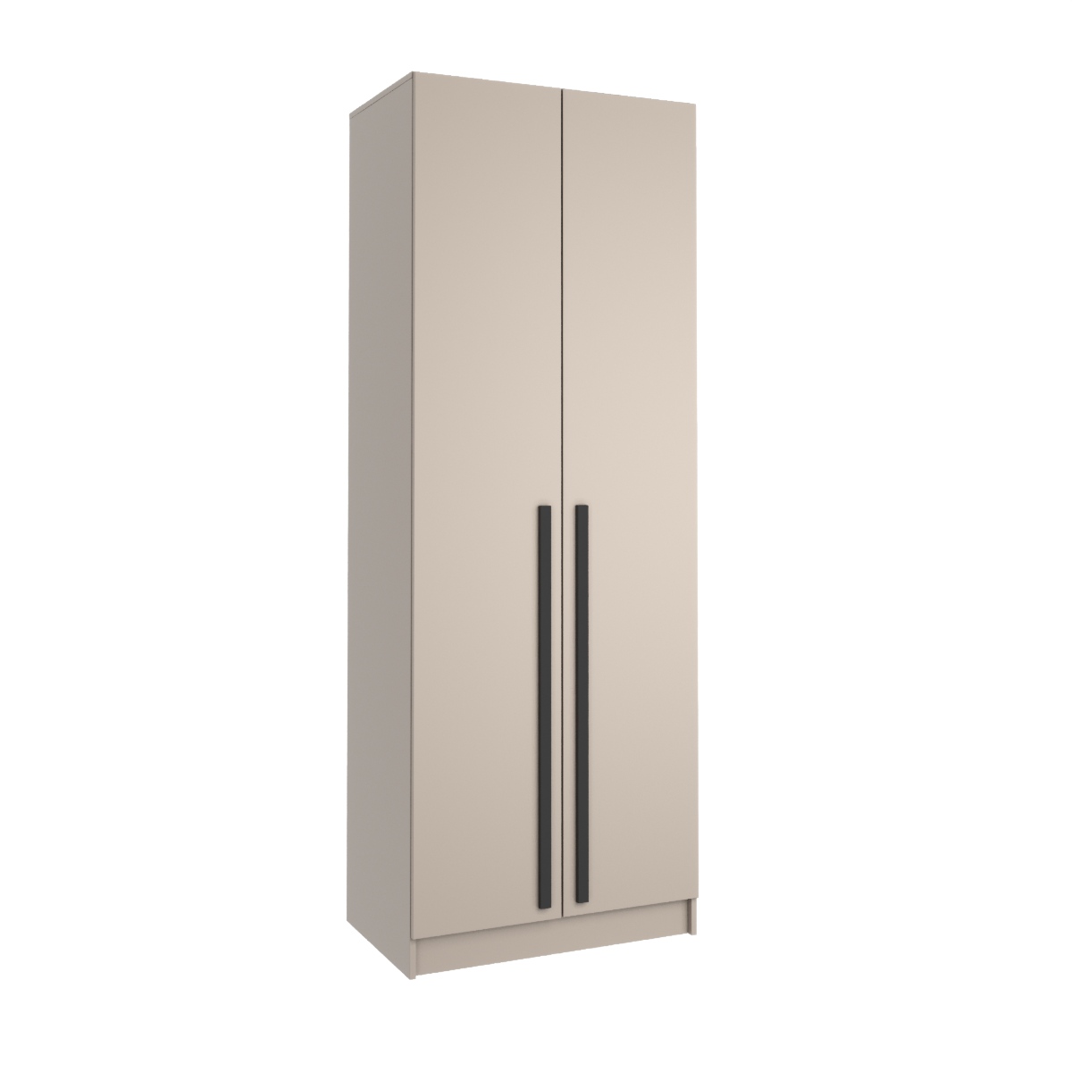Удлиненные ручки МДФ черного цвета придают оригинальности простому лаконичному дизайну шкафа.
