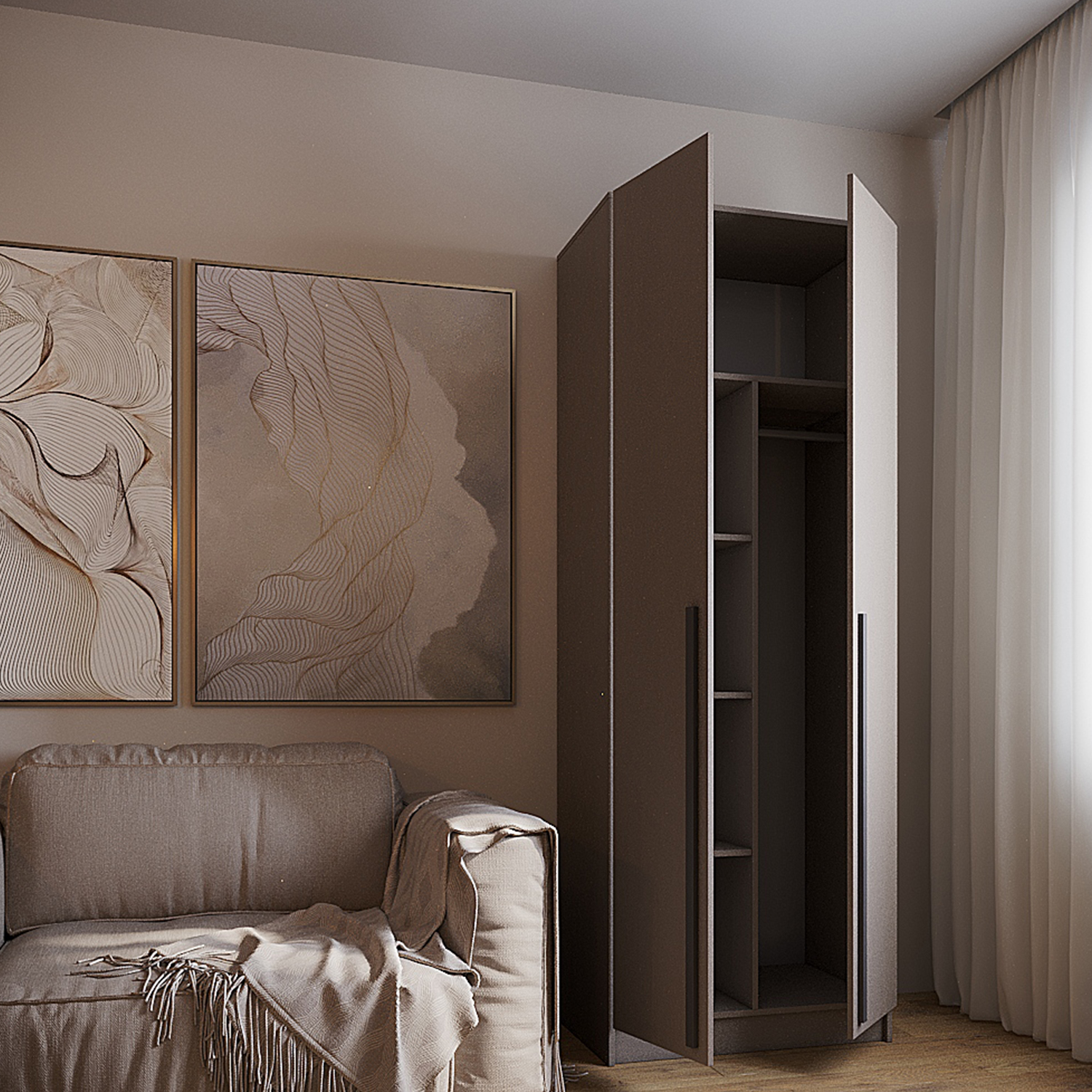 Распашной шкаф для одежды выполнен из практичного ЛДСП, предназначен для хранения одежды, обуви, головных уборов и аксессуаров.