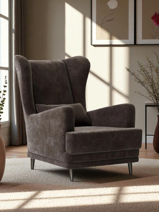 Мягкое кресло Вегас сделано из фанеры и не содержит вредных веществ и материалов, что делает ее безопасной для здоровья и безопасной для окружающей среды. Ткань велюр Crush. Наполнитель ППУ имеет несколько преимуществ перед другими материалами, используемыми в производстве мебели. Во-первых, он обладает высокой упругостью и комфортом, что делает его идеальным для создания мягкой мебели и подушек. Во-вторых, ППУ является долговечным материалом, который не теряет своих свойств со временем и не деформируется при использовании.Высокие опоры создают визуальный эффект легкости и позволяют просто и удобно совершить уборку под креслом не передвигая его. Так же большим плюсом является то, что под креслом проходит любой робот пылесос. Ножки кресла выполнены из массива березы, что делает конструкцию кресла надежной и стабильной. Мягкое кресло на ножках станет оригинальным украшением вашего дома. Выполнено в духе английского кресла с ушами. Выверенные формы спинки, мягкие подлокотники в совокупности с правильной эргономикой посадки и укутывающими боковинами сделают кресло любимцем домочадцев и ваших гостей. Мебель для дома. Мягкая подушка в комплекте способствует более комфортному пребыванию в каминном кресле. Плотное соединение нитей препятствует образованию «зацепок» и выбивающихся ниток, не растягивается. Выдерживает нагрузку до 150 кг. Просим обратить внимание, что опоры могут быть вложены внутрь подушки. Классическое широкое кресло - это не только универсальная и стильная мебель, но и функциональное дизайнерское решение для любого помещения. Может быть использовано в разных комнатах, включая гостиную или кухню, у камина для комфортного размещения гостей, в спальню для релаксации, отдыха и чтения книг. В детской комнате можно разместить кресло и использовать для кормления или укачивания детей. Благодаря универсальному яркому дизайну данный предмет мебели впишется в рабочий кабинет, офис, салон красоты и лаунж зону, чтобы ваши клиенты могли чувствовать себя комфортно и расслабленно. Если вы ищете мебель для своей дачи или балкона, то компактное кресло станет идеальным выбором. При правильном подборе цвета ткани кресло будет гармонично смотреться в таких стилях, как: скандинавский, классический, прованс и лофт. Для полного вашего расслабления мы предусмотрели дополнительную опцию поддержки для ног у этого кресла для дома (что очень важно для профилактики заболеваний сосудов). К каждому нашему мягкому креслу вы сможете приобрести пуф в цвет кресла схожий по дизайну. Собрать тем самым полный комплект для домашнего отдыха (пуфик приобретается отдельно).Мы ответственно подходим к подбору материалов для изготовления каждого изделия. Также мы тщательно проверяем мебель перед отправкой нашим дорогим клиентам. Нам важно, чтобы вы гордились покупкой. Ведь это значит, что мы не зря каждое утро приходим на работу!В процессе эксплуатации рекомендуем периодически пылесосить обивку на минимальной мощности с использованием узкой насадки для мебели. Таким образом, вы сможете устранить с поверхности ткани пыль и шерсть животных. Слабые загрязнения можно удалить влажными салфетками, допустимо применение мыльного раствора с нейтральным Ph (например, детское мыло). Также для продления ощущения новизны и лоска ткани рекомендуем время 