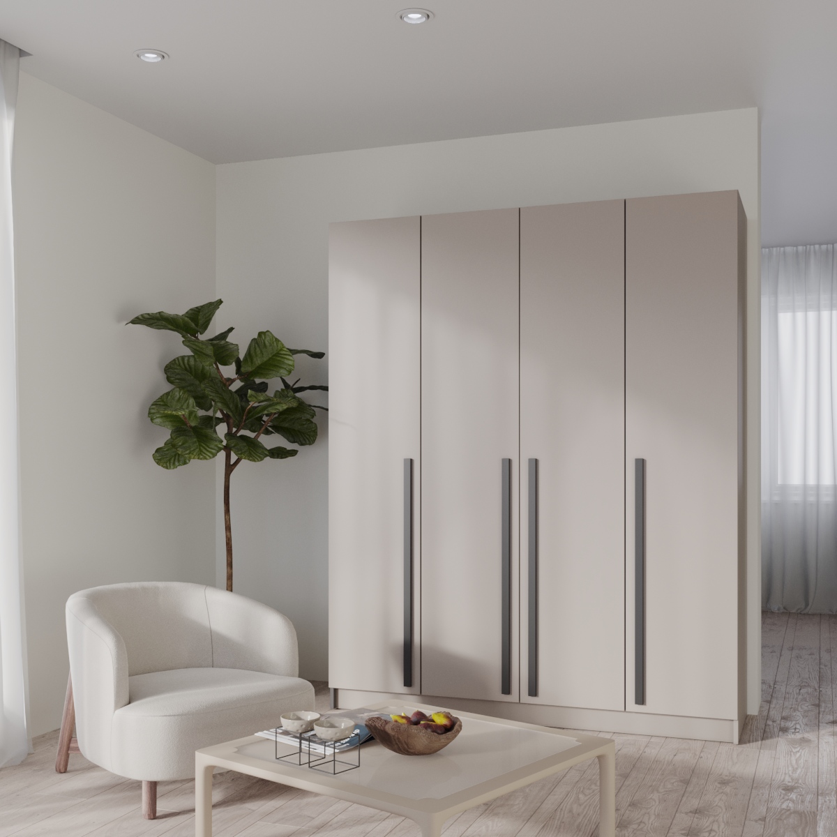 Удлиненные ручки МДФ черного цвета придают оригинальности простому лаконичному дизайну шкафа.