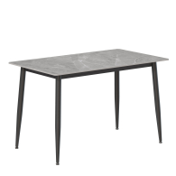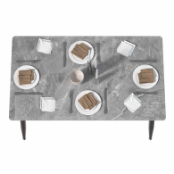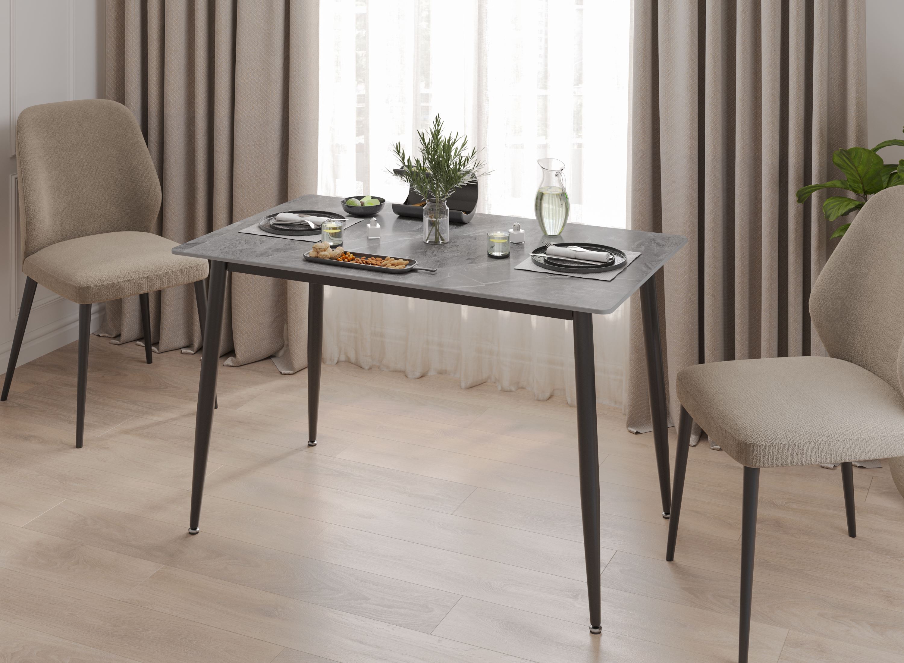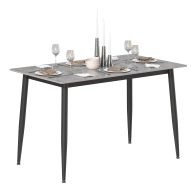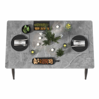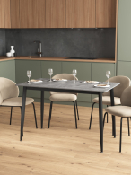 Максимальная нагрузка стола составляет 80 кг, что делает его пригодным для повседневного использования и сервировки. Установка столешницы на присоски упрощает монтаж и при необходимости её демонтаж или замену. Чёрная металлическая рама обеспечивает прочную опору и подчёркивает современный стиль изделия. Комбинация тонкой каменной столешницы и прочной металлической основы делает стол визуально лёгким, но функционально надёжным.