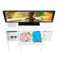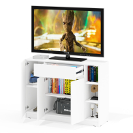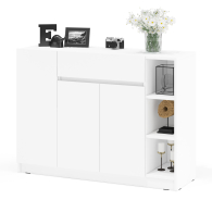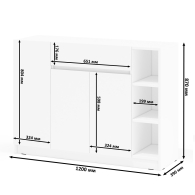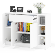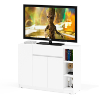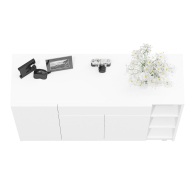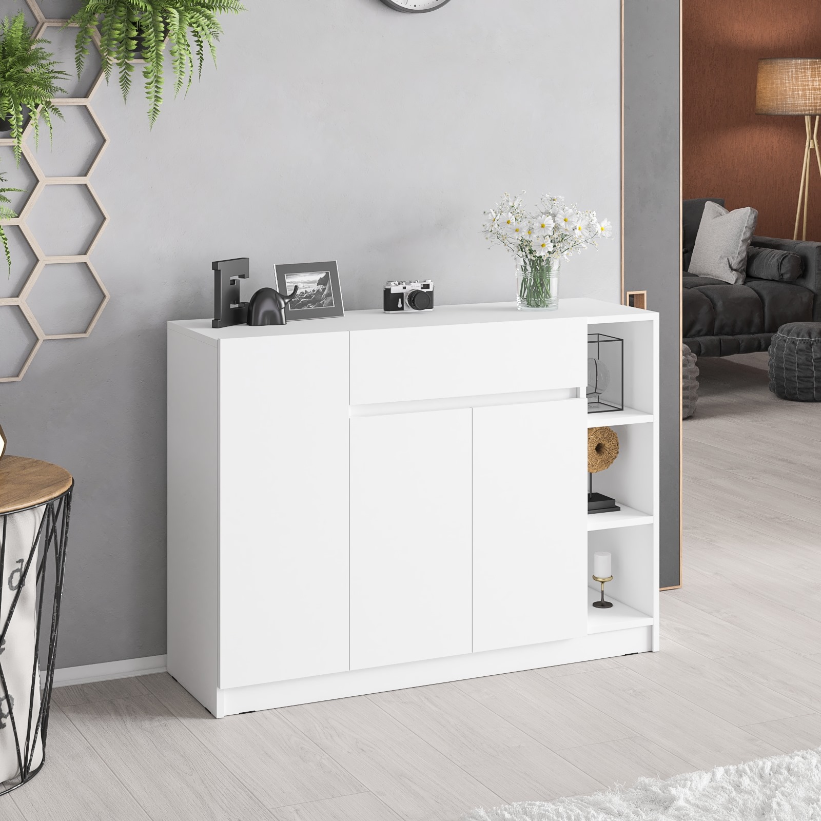 Конструкция включает правое отделение с распашной дверкой и съёмной полкой, центральный выдвижной ящик на шариковых направляющих длиной 350 мм, нижнее отделение со стационарной полкой за двумя дверками, а также открытую нишу с двумя съёмными полками справа. Отсутствие ручек и открывание за край фасадов создают лаконичный и современный внешний вид. Благодаря разнообразному наполнению, комод подходит для хранения одежды, обуви, аксессуаров, документов и других предметов. Пластиковые подпятники защищают пол от повреждений. Тумба-комод имеет НЕ универсальную сборку — ниша с открытыми полками всегда располагается справа.