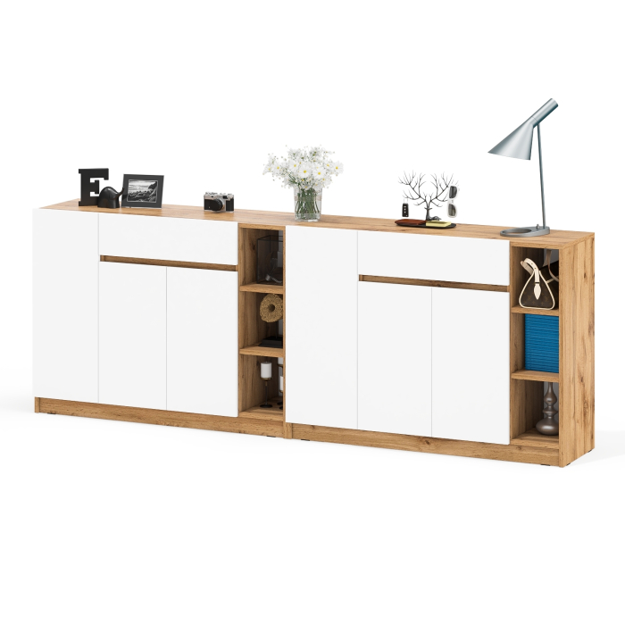 Конструкция представляет собой два объединённых в один блок тумбы-комода, что позволяет разместить больше вещей и аксессуаров. В каждом модуле предусмотрено правое отделение с распашной дверкой и съёмной полкой. По центру расположен выдвижной ящик на шариковых направляющих длиной 350 мм. Ниже находится отделение со стационарной полкой за двумя дверками. Справа предусмотрена открытая ниша с двумя съёмными полками. Отсутствие ручек и открывание за край фасадов создают минималистичный и аккуратный внешний вид. Такое наполнение даёт возможность удобно хранить одежду, бельё, документы, обувь, книги и многое другое. Пластиковые подпятники защищают пол от царапин и износа.