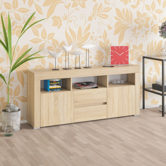 Компактная, но достаточно широкая ТВ-тумба Сура 1604 легко разместит телевизор и декоративные элементы, а продуманное внутреннее пространство вмещает всё необходимое. Центральная зона с двумя выдвижными ящиками на шариковых направляющих полного выдвижения. Над ящиками — три открытые ниши, удобные для размещения медиатехники, декора или книг. По бокам расположены закрытые секции с распашными дверцами, где можно скрыть кабели, аксессуары и другие предметы. Открытие ящиков и дверок осуществляется за край фасадов — без лишних деталей и фурнитуры, что подчёркивает минимализм дизайна. Тумба установлена на 6 пластиковых опор высотой 20 мм. Её лаконичный дизайн с гладкими фасадами без ручек гармонично впишется в любой интерьер, а продуманная организация хранения поможет поддерживать идеальный порядок.
