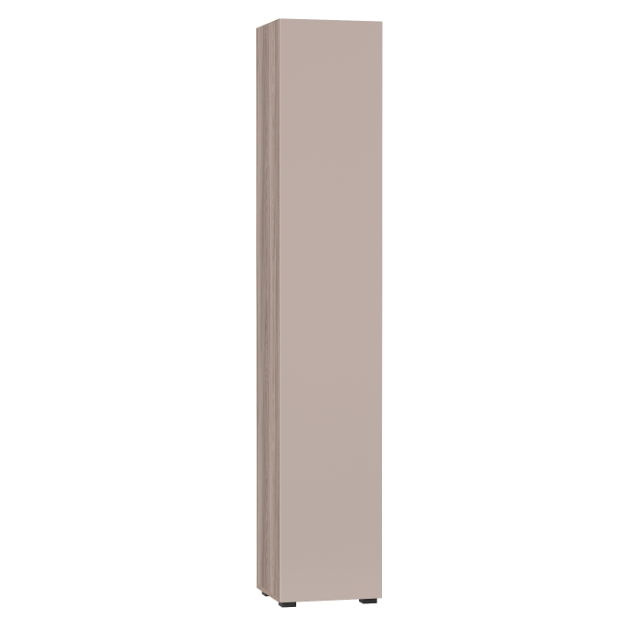 За распашной дверкой расположены два выдвижных ящика с направляющими полного выдвижения, предназначенные для хранения личных вещей и мелочей. Над ящиками находятся две полки, а снизу — одна полка; все полки можно снимать или регулировать по высоте для удобного использования пространства. Надёжное крепление полок обеспечивают специальные полкодержатели с шипом, дополнительно усиливающие каркас шкафа. Распашной фасад с механизмом Push-to-Open обеспечивает удобное открытие без ручек. Петли с доводчиками гарантируют плавное и тихое закрытие дверей. Задняя стенка в паз обеспечивает плотное примыкание к стене и аккуратный внешний вид изделия. Для шкафа-пенала предусмотрено надёжное крепление к стене, обеспечивающее устойчивость и безопасность при эксплуатации.