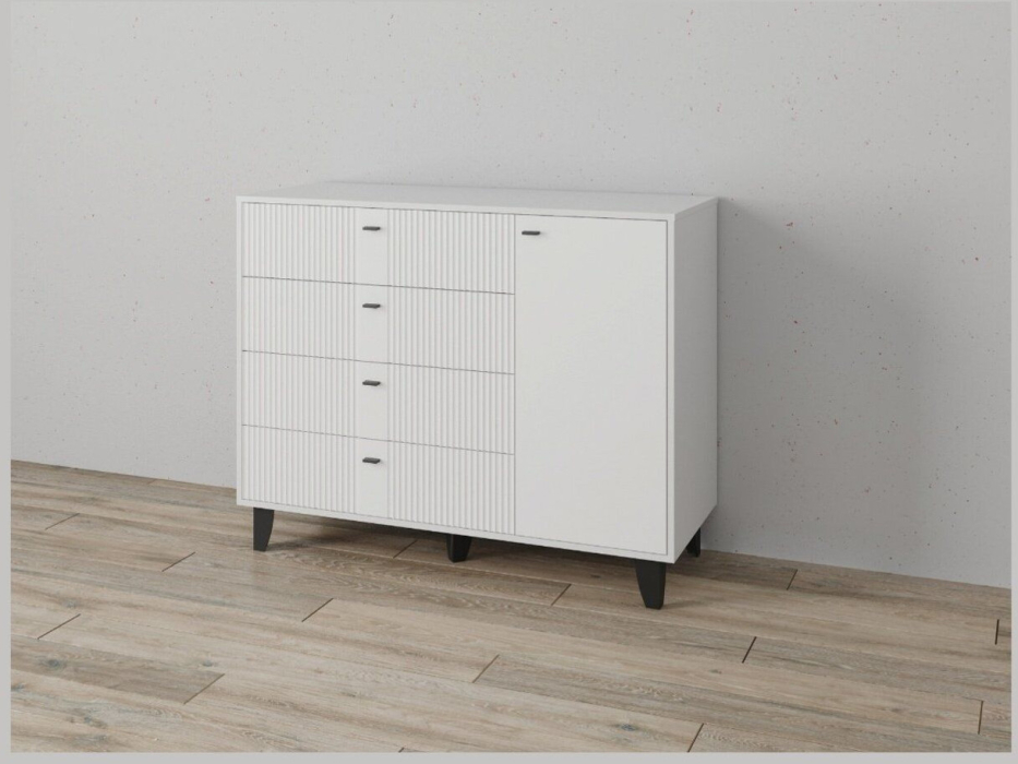 Комод с четырьмя выдвижными ящиками и дверцей выполнен в современном стиле, который гармонично впишется в любой интерьер. Удачное сочетание декоров придает ему утонченность и элегантность.