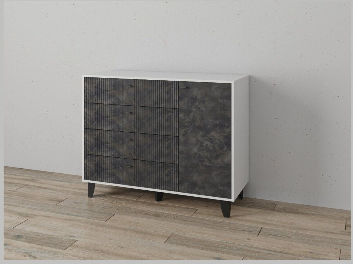 Комод с четырьмя выдвижными ящиками и дверцей выполнен в современном стиле, который гармонично впишется в любой интерьер. Удачное сочетание декоров придает ему утонченность и элегантность.