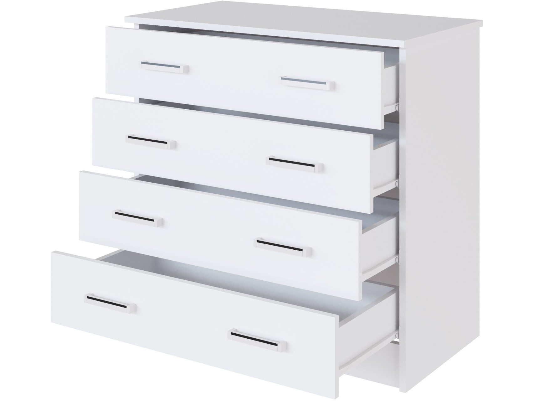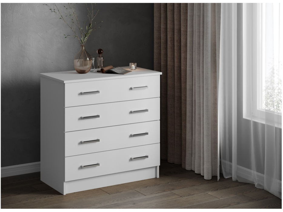 Удобство использования: комод оснащен четырьмя ящиками с роликовыми направляющими, обеспечивающими плавное и бесшумное открывание.