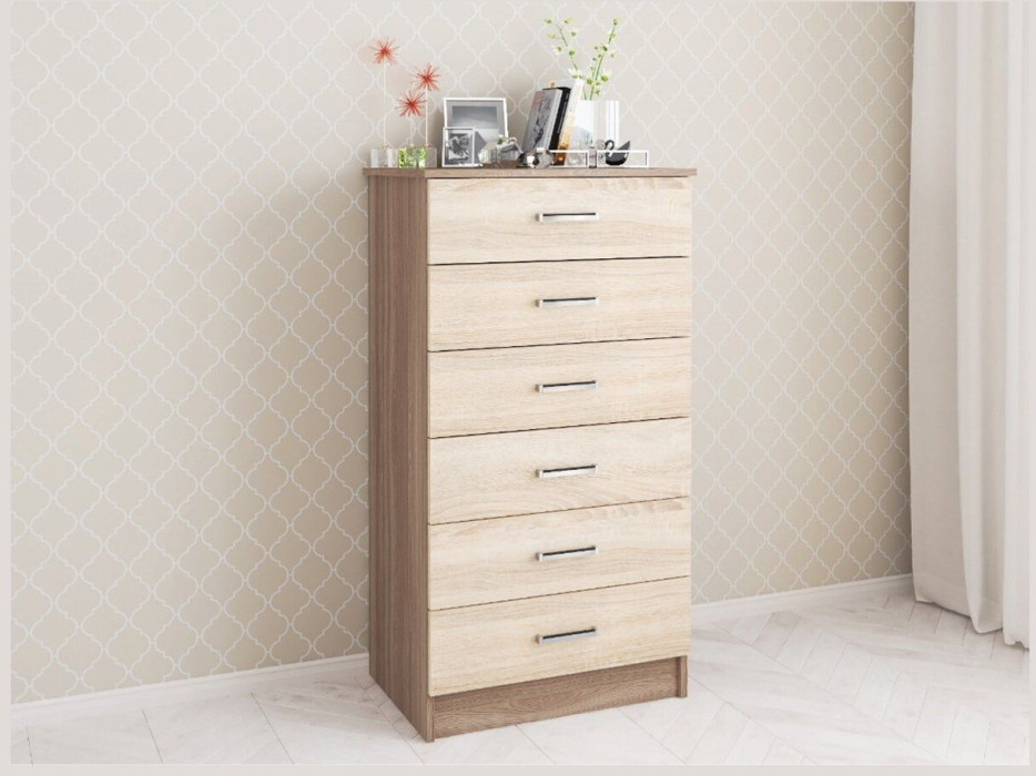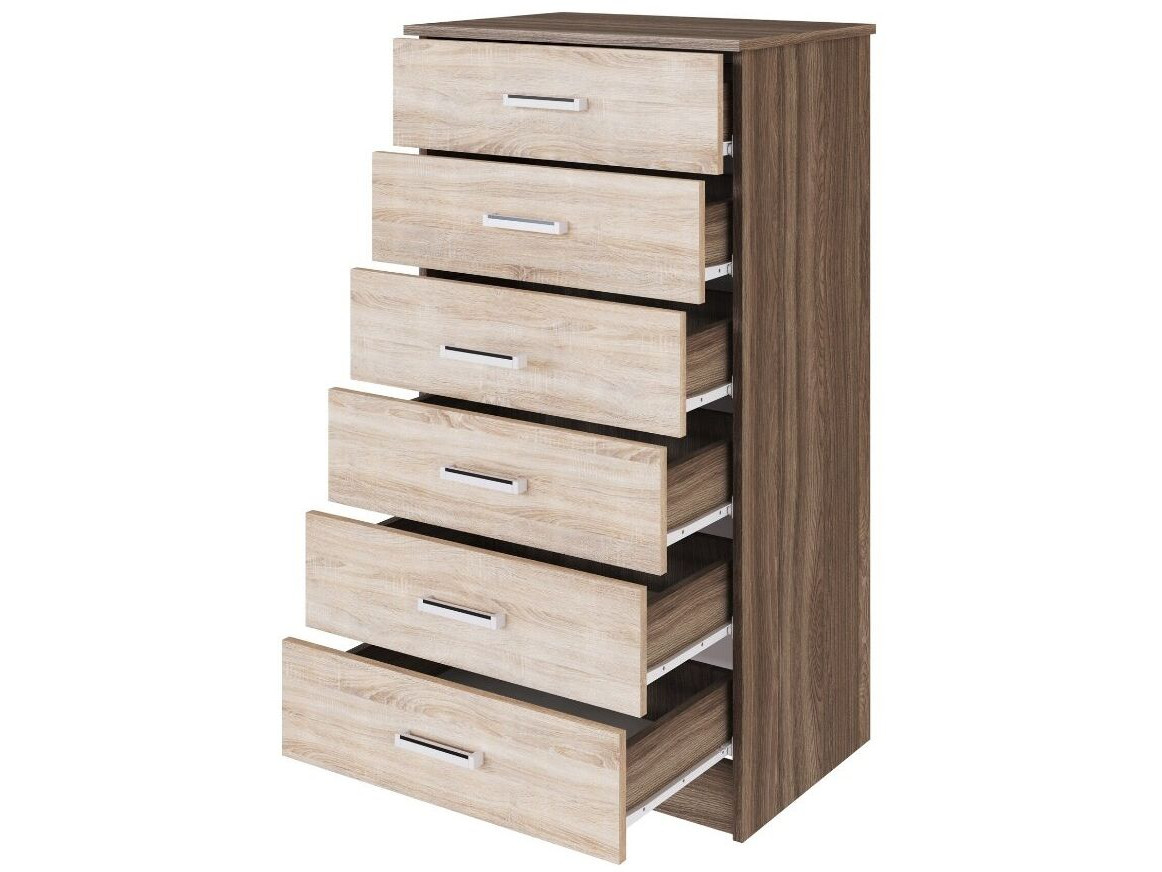 Напольная конструкция комода включает в себя 6 вместительных ящиков, обеспечивающих удобное хранение различных предметов. Максимальная нагрузка на каждый ящик составляет 8 кг, что позволяет использовать комод для хранения тяжелых предметов.