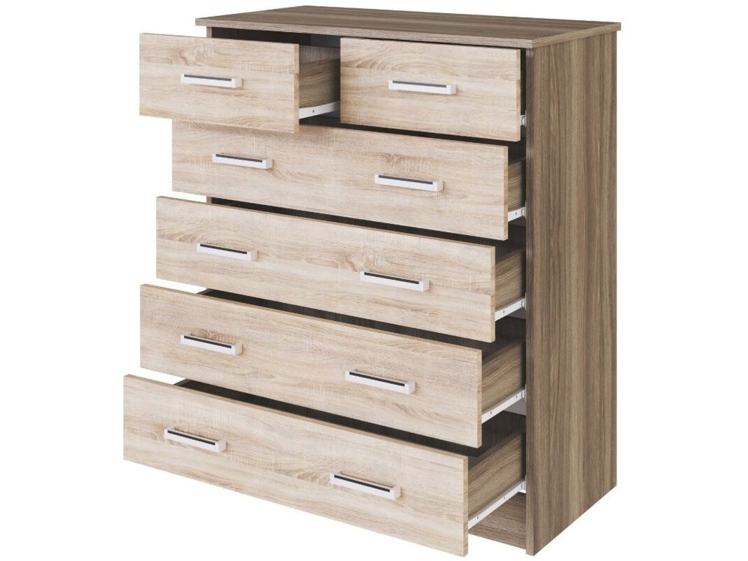 Корпус и фасад комода изготовлены из качественного ЛДСП, покрытого пленкой. Это обеспечивает прочность и долговечность изделия, а также простоту ухода за ним.
