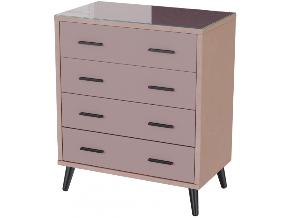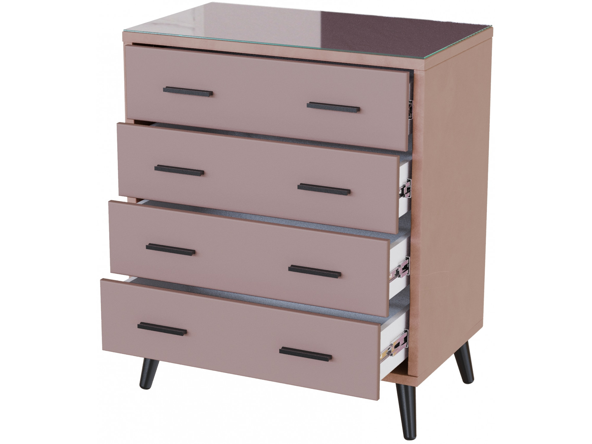 Совершенство в деталях: шариковые направляющие обеспечивают плавное выдвижение ящиков, а металлические ручки добавляют нотку современности. Стекло с еврокромкой защищает поверхность, сохраняя её первозданную красоту.