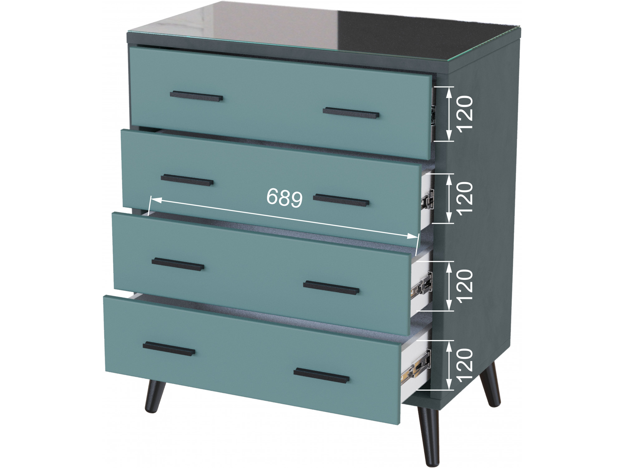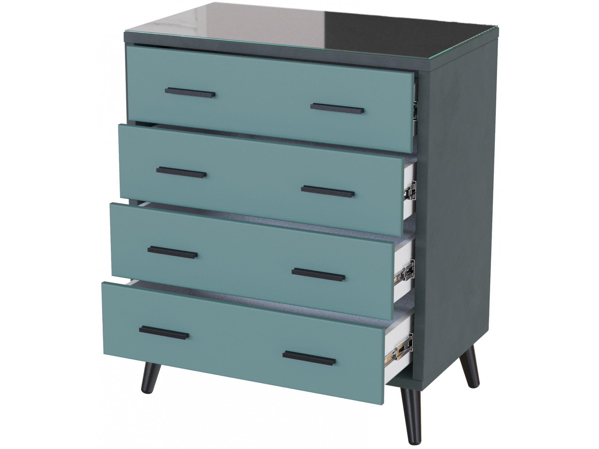 Совершенство в деталях: шариковые направляющие обеспечивают плавное выдвижение ящиков, а металлические ручки добавляют нотку современности. Стекло с еврокромкой защищает поверхность, сохраняя её первозданную красоту.