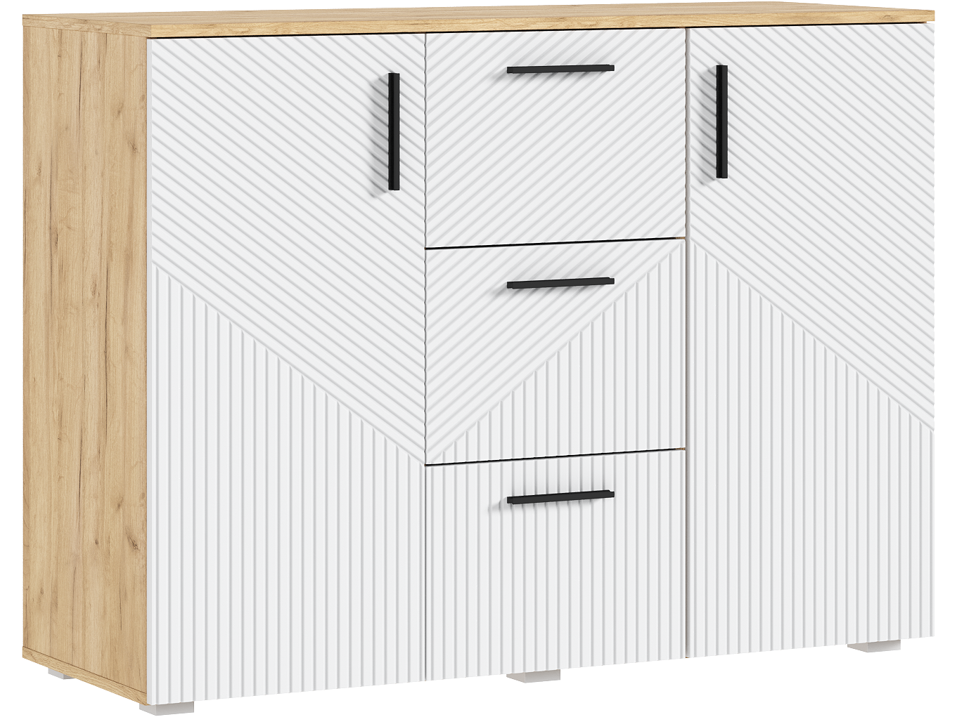 Продуманная конструкция включает три удобных выдвижных ящика и две распашные двери, обеспечивая оптимальную организацию хранения различных вещей. Комод сочетает в себе современную эстетику и функциональность, позволяя эффективно использовать пространство.