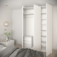Внутри шкафа вы найдете встроенный комод с шариковыми направляющими полного выдвижения, вместительные полки и штангу для одежды.