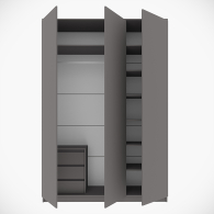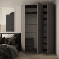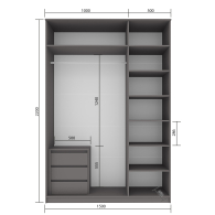 Внутри шкафа вы найдете встроенный комод с шариковыми направляющими полного выдвижения, вместительные полки и штангу для одежды.