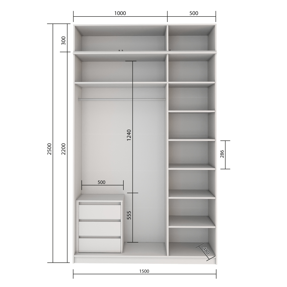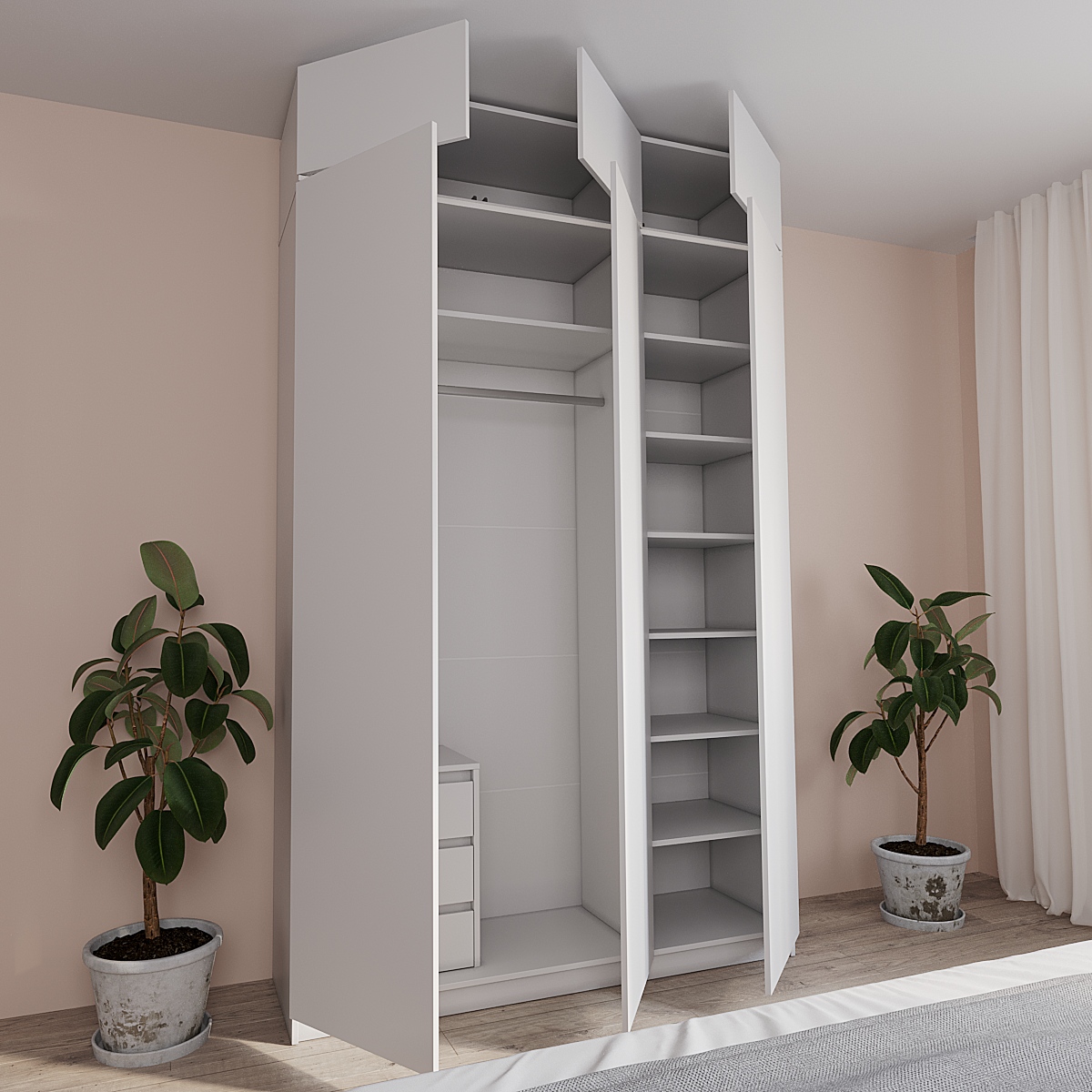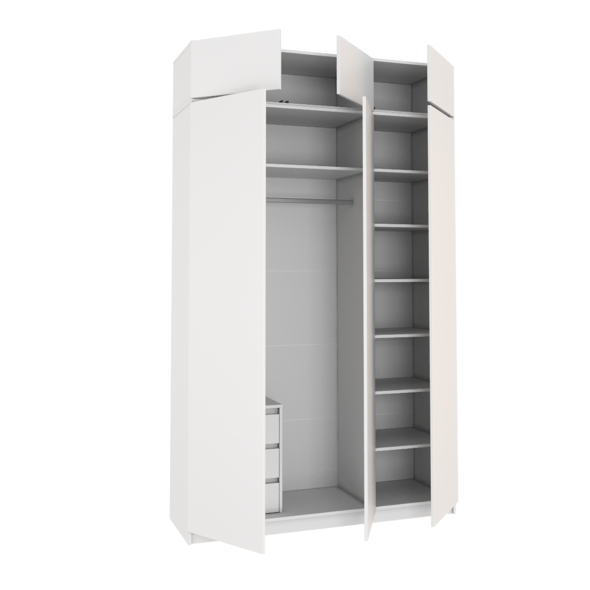 Внутри вы найдете вместительный комод с шариковыми направляющими полного выдвижения, полки и штангу для одежды.
